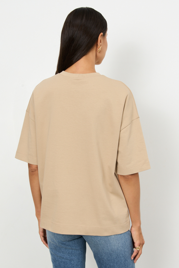 Джемпер из эластичного полотна. Свободный силуэт со спущенной линией плеча и рукавом до локтя. Вырез горловины оформлен бейкой. В таблице размеров представлены параметры человека, а не изделия.