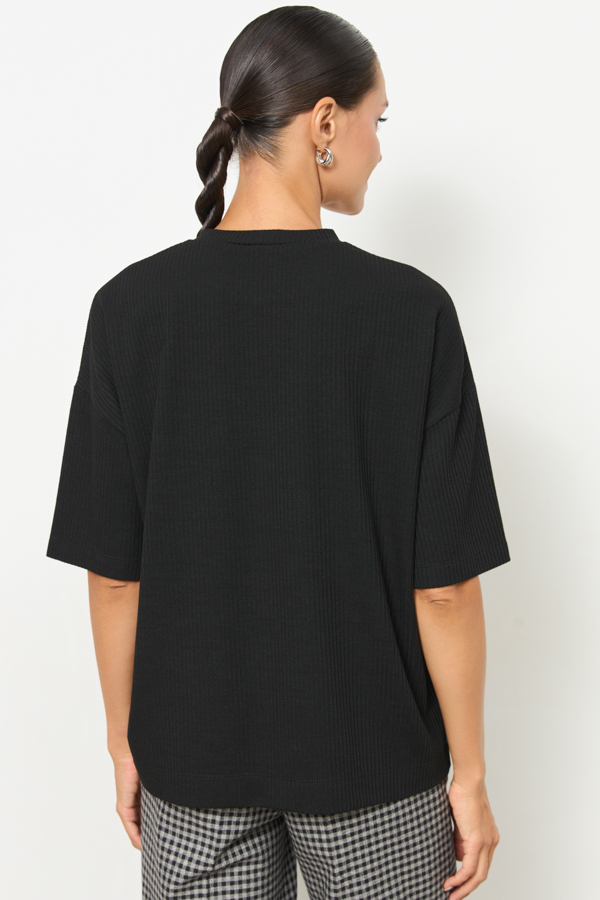 Джемпер из фактурного эластичного полотна. Свободный силуэт со спущенной линией плеча и коротким рукавом. Вырез горловины оформлен бейкой. В таблице размеров представлены параметры человека, а не изделия.