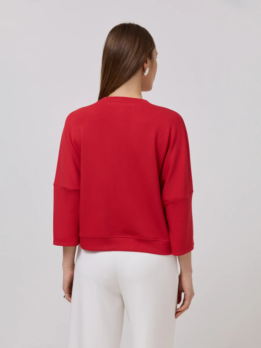 Женский лонгслив свободного кроя выполнен в насыщенном красном оттенке и станет эффектным элементом повседневного гардероба. Модель отличается лаконичным дизайном с округлым вырезом горловины и укороченными рукавами длиной 3/4. Прямой силуэт и заниженная линия плеча обеспечивают комфортную посадку и создают расслабленный, современный образ.