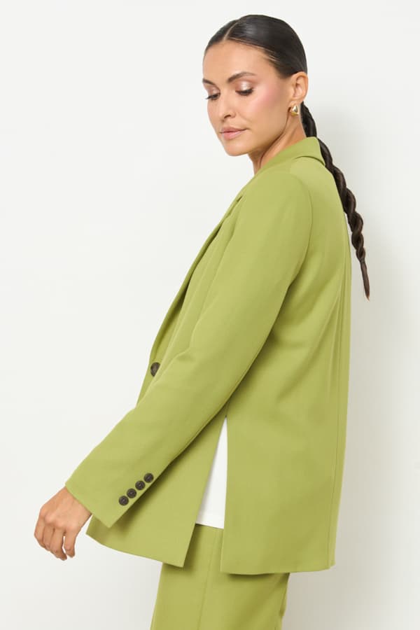 Жакет из костюмной ткани прямого силуэта с разрезами в боковых швах. Изделие с английским воротником и застежкой на пуговицу. На передней части жакета выполнен нагрудный карман с листочкой и карманы в рамку. Втачной длинный рукав, снизу шлица с пуговицами. Изделие идеально держит форму, имеет четкую линию плеча благодаря плечевым накладкам. Жакет на подкладке.