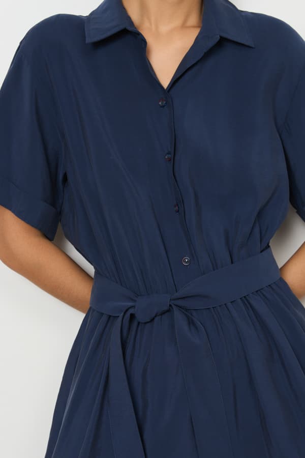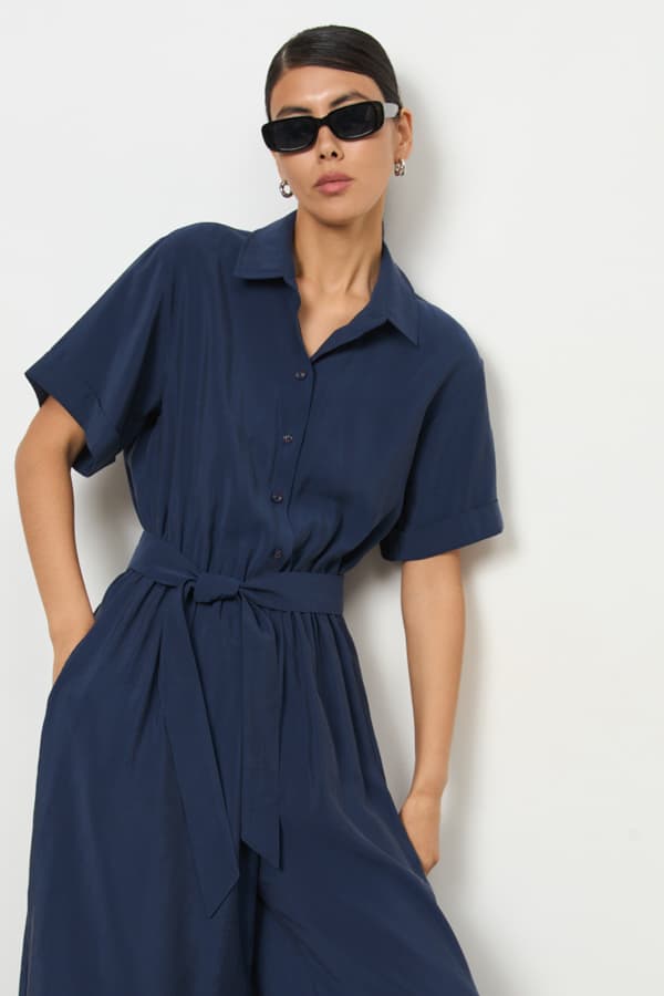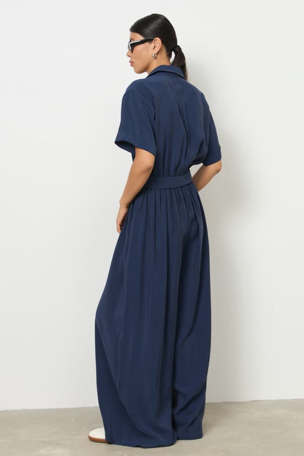 Стильный комбинезон из вискозной ткани с крэш-эффектом. Изделие отрезное по линии талии, с резинкой. Свободный силуэт с застёжкой на пуговицы, в боковых швах карманы. Втачной короткий рукав с отворотом. На задней части изделия выполнена кокетка с небольшой складкой. Вырез горловины обработан отложным воротником на стойке. В комплекте пояс из основной ткани.