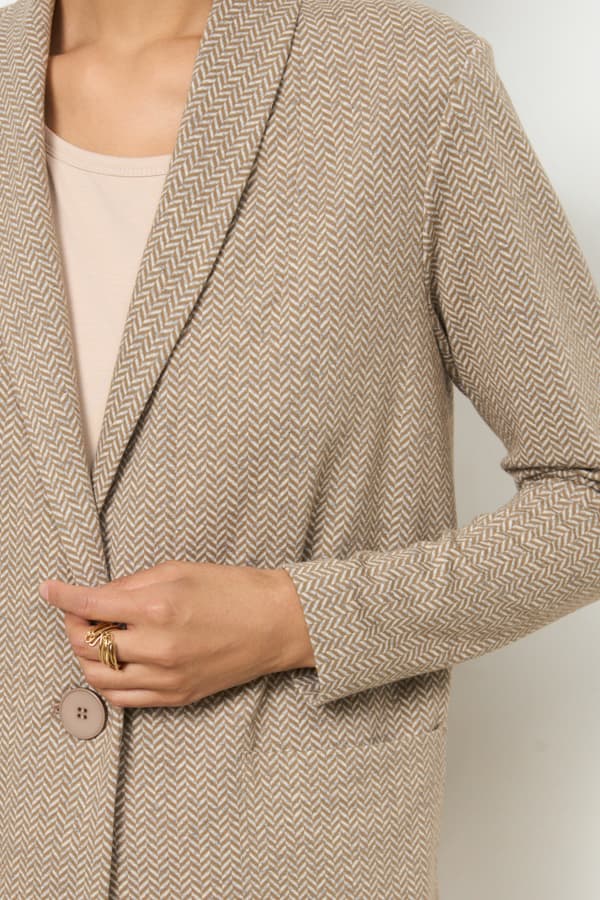 Костюм из эластичного полотна. Брюки прямого силуэта. Пояс с эластичной резинкой. Жакет прямого свободного кроя с женственным шалевым воротником. На передней части изделия застежка на пуговицу. Втачной рукав. Изделие с плечевыми накладками, которые при желании можно убрать.