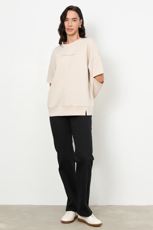 Джемпер из эластичного полотна свободного силуэта. Втачной длинный рукав оригинального кроя со спущенной линией плеча. Круглый вырез горловины оформлен бейкой. По низу изделия и рукавов выполнены притачной пояс и манжеты из основной ткани. В таблице размеров представлены параметры человека, а не изделия.