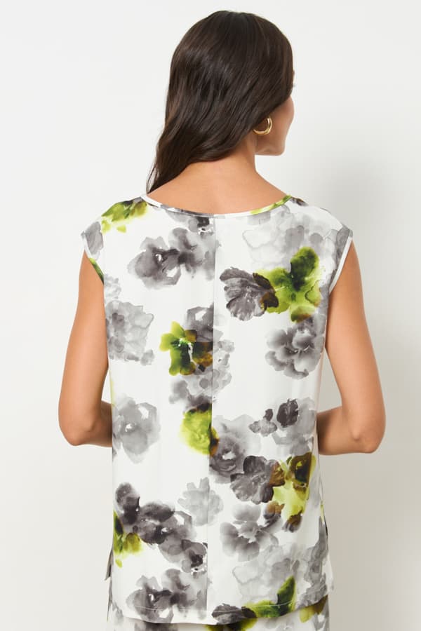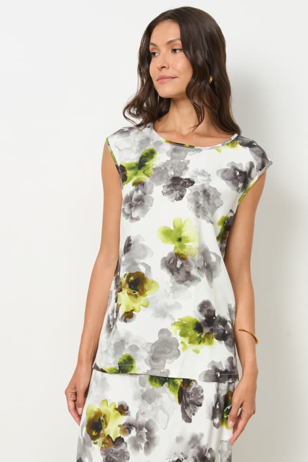 Топ из вискозной ткани. Свободный силуэт с разрезами в боковых швах. Круглый вырез горловины и проймы окантованы косой бейкой из основной ткани.