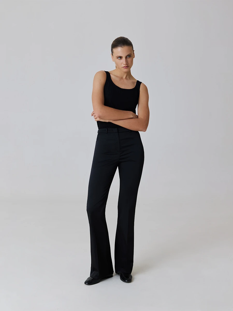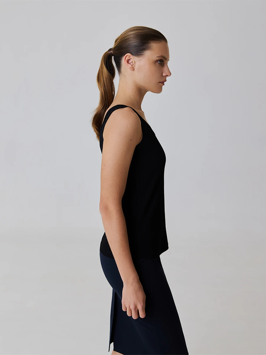 Черная трикотажная майка - одна из самых базовых и универсальных единиц повседневного гардероба. Модель выполнена из мягкой эластичной ткани в рубчик премиального качества. Прилегающий крой гармонично подчеркивает достоинства фигуры, а глубокий овальный вырез элегантно демонстрирует красивую линию ключиц. Стандартная длина позволяет носить майку как в заправленном виде с юбками и джинсами, так и навыпуск.