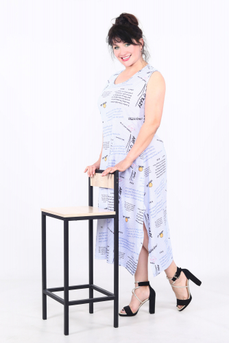 Платье полуприлегающего силуэта, с крадратным вырезом спереди и борцовкой сзади, длиной выше колена, без рукавов. Бретели на полочке выполнены из кашкорсе с контрастными полосами. Вдоль боковых швов расположены лампасы и накладные карманы из отделочного полотна. Горловина и проймы обработаны бейкой из основного полотна.