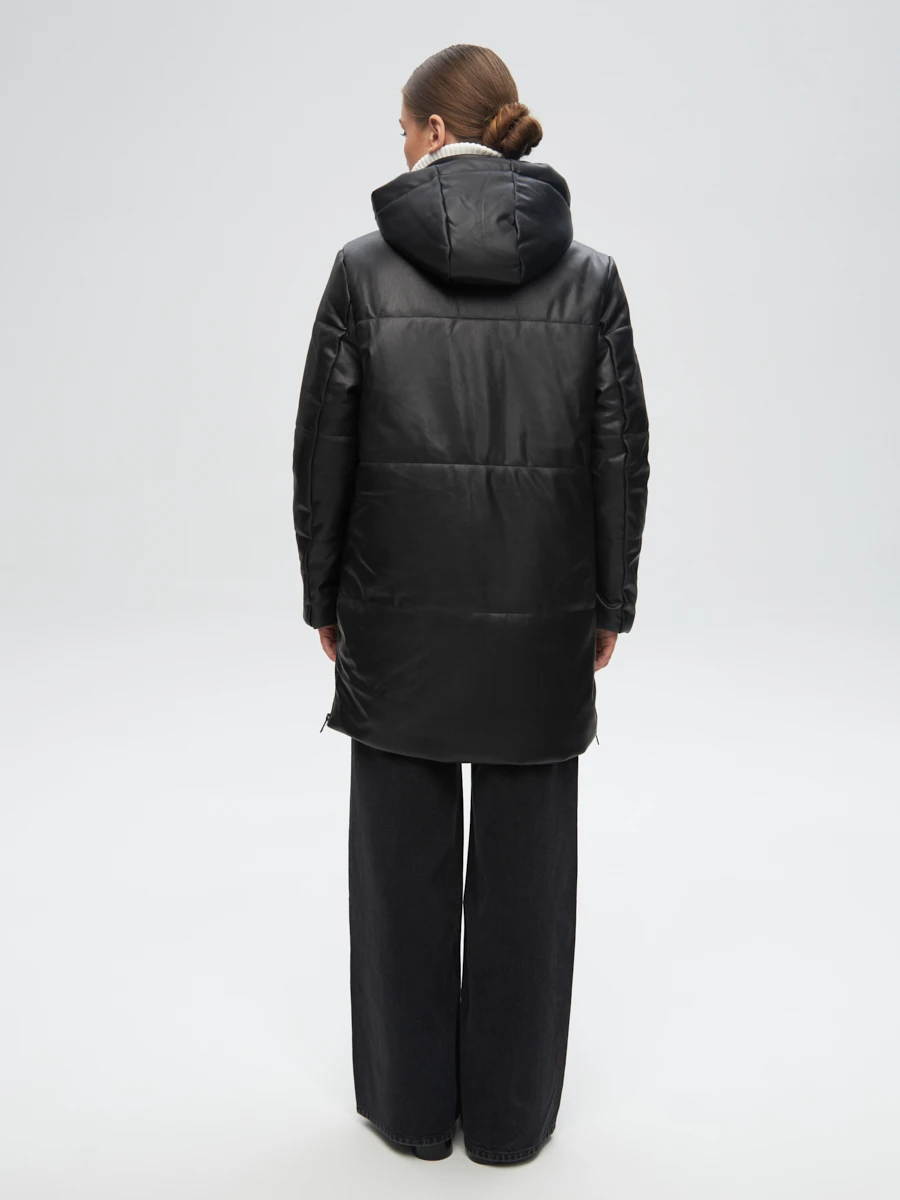 Непромокаемый пуховик средней длины черного цвета, с большим пристегивающимся капюшоном на завязках. Отлично подойдет для дождливой погоды.