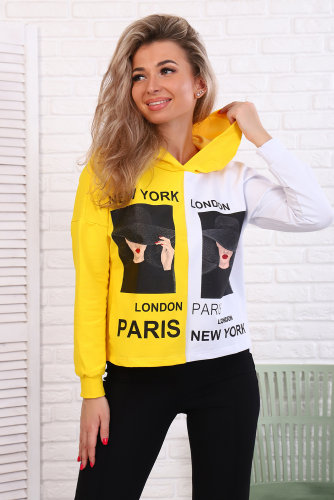 Толстовка женская укороченная со спущенным плечом, втачным длинным рукавом на манжете, с капюшоном. На детали переда печать. Цвет: ; Материал: футер 2-х нитка;футер 2-х нитка; Состав: 80% хлопок, 15% п/э, 5% лайкра.