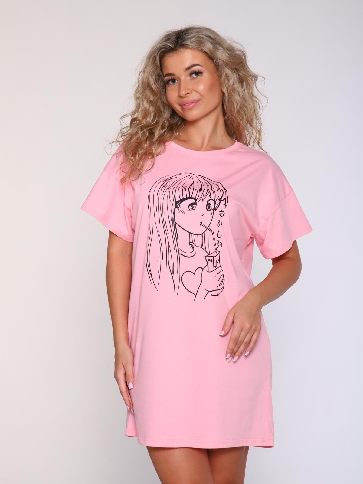 Футболка "Аиша" свободного кроя, со спущенным плечом и коротким рукавом, выполнена из однотонного трикотажного полотна "кулирка" и украшена принтом. Вырез горловины овальной формы обработан обтачкой из основной ткани.