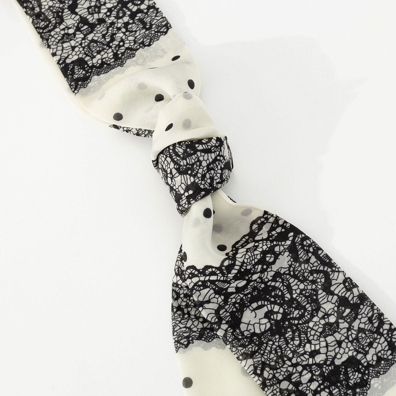 Графичный чёрно‑белый принт с кружевным орнаментом и горошком напоминает винтажные галстуки – абсолютно в духе свободы 70-х! Завяжи ленту свободным узлом вместо галстука на открытой блузе или топе на бретелях – образ сразу станет более кинематографичным и загадочным. Идеальная ширина и заострённые края позволяют завязывать аккуратные узлы у шеи, на полях шляпы или на ручках мини‑сумок, добавляя образу пикантный акцент.