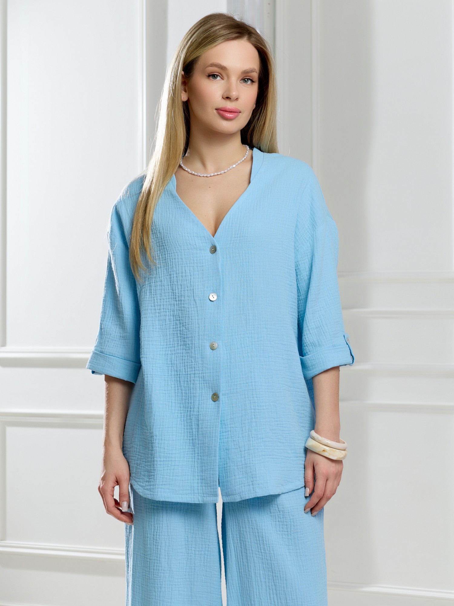 Блузка женская из фактурного гладкокрашеного полотна, с втачными рукавами длиной 3/4, с центральной бортовой застежкой на 4 обметанные петли и 4 пуговицы, с горловиной фигурной формы и небольшим отделочным воротником. Нижние срезы рукавов и низ изделия обработаны подгибкой. Рукава - с хлястиками, с петлей и пуговицей, позволяющими регулировать длину рукавов на фигуре и создающими красивую драпировку.