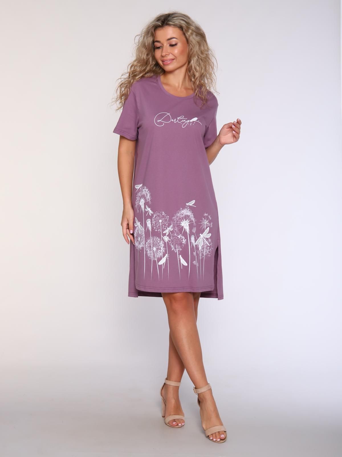 Туника из гладкокрашеного трикотажного полотна "кулирка", свободного покроя, прямого силуэта, с короткими втачными рукавами, горловиной овальной формы, обработанной обтачкой из основной ткани, принтом в центре переда и разрезами в нижней части боковых швов. Модным элементом является разность длин полочки и спинки.