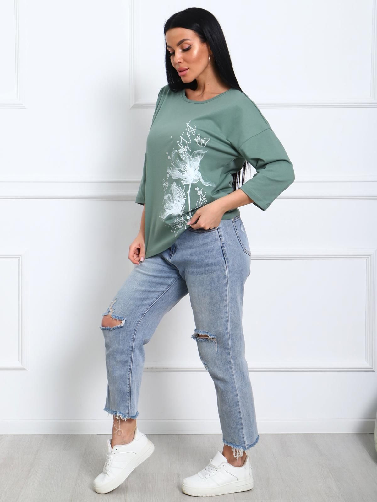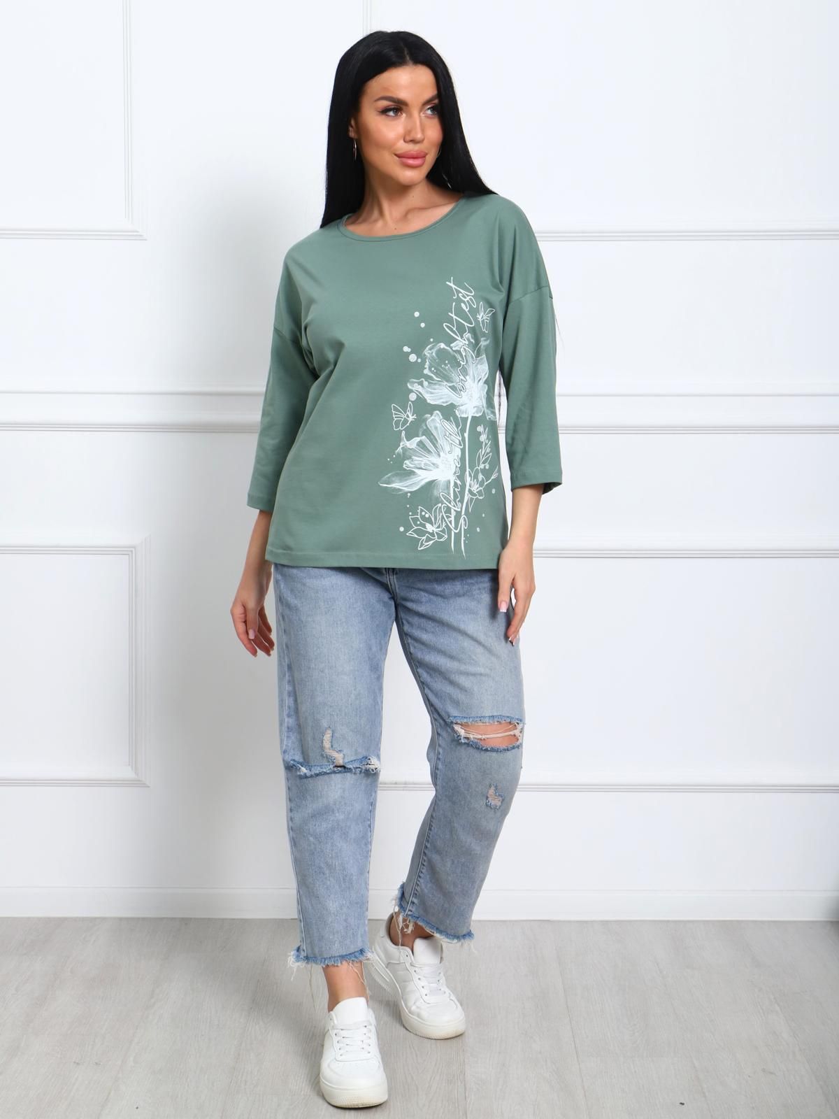 Футболка женская с растительным принтом , из натурального трикотажа. Отличный вариант одежды, который позволяет скрыть все недостатки фигуры и подчеркнуть достоинства.Мягкие линии делают эту модель очень женственной. Горловина круглой формы. Полуприлегающий силуэт, рукав три четверти. Принт нанесен непосредственно в ткань футболки - не наклейка. Данный принт выделит Вас среди других девушек.