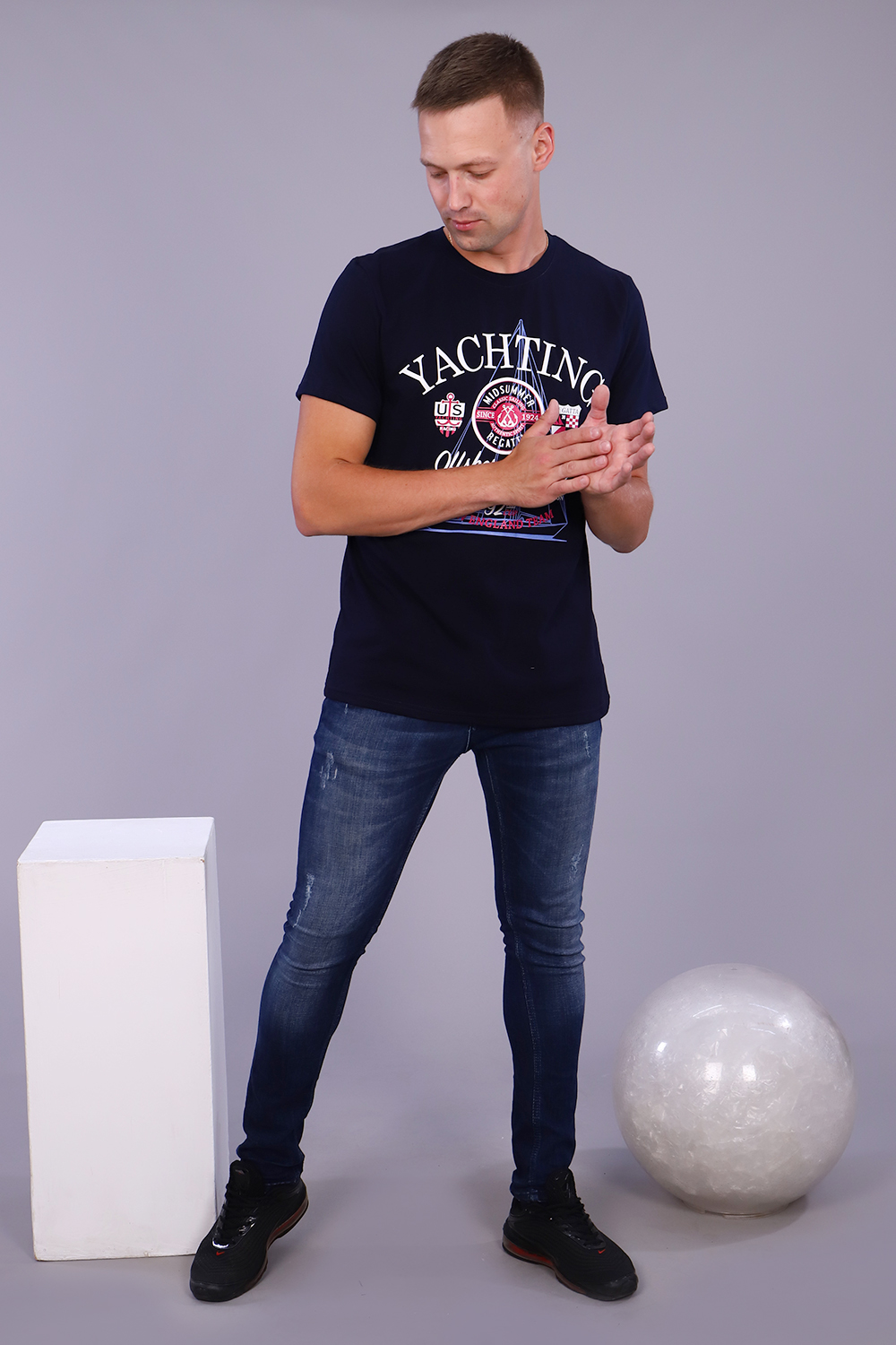 Футболка мужская с коротким рукавом. Данная модель выполнена из трикотажного полотна кулирка (хлопок 100%). На полочке присутствует принт в области груди. Рукава короткие, горловина круглая обработана кантом.