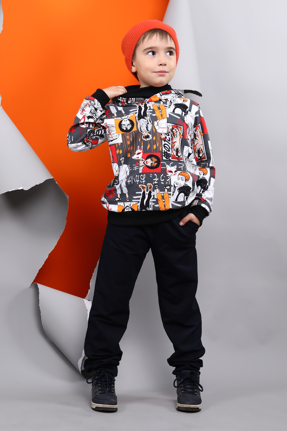 Толстовка детская с капюшоном. В данной модели на горловине присутствует воротник стойка выполненный из эластичного трикотажного плотна кашкорсе. Низ изделия и манжеты так же обработаны кашкорсе. Прекрасный вариант для детского активного отдыха.