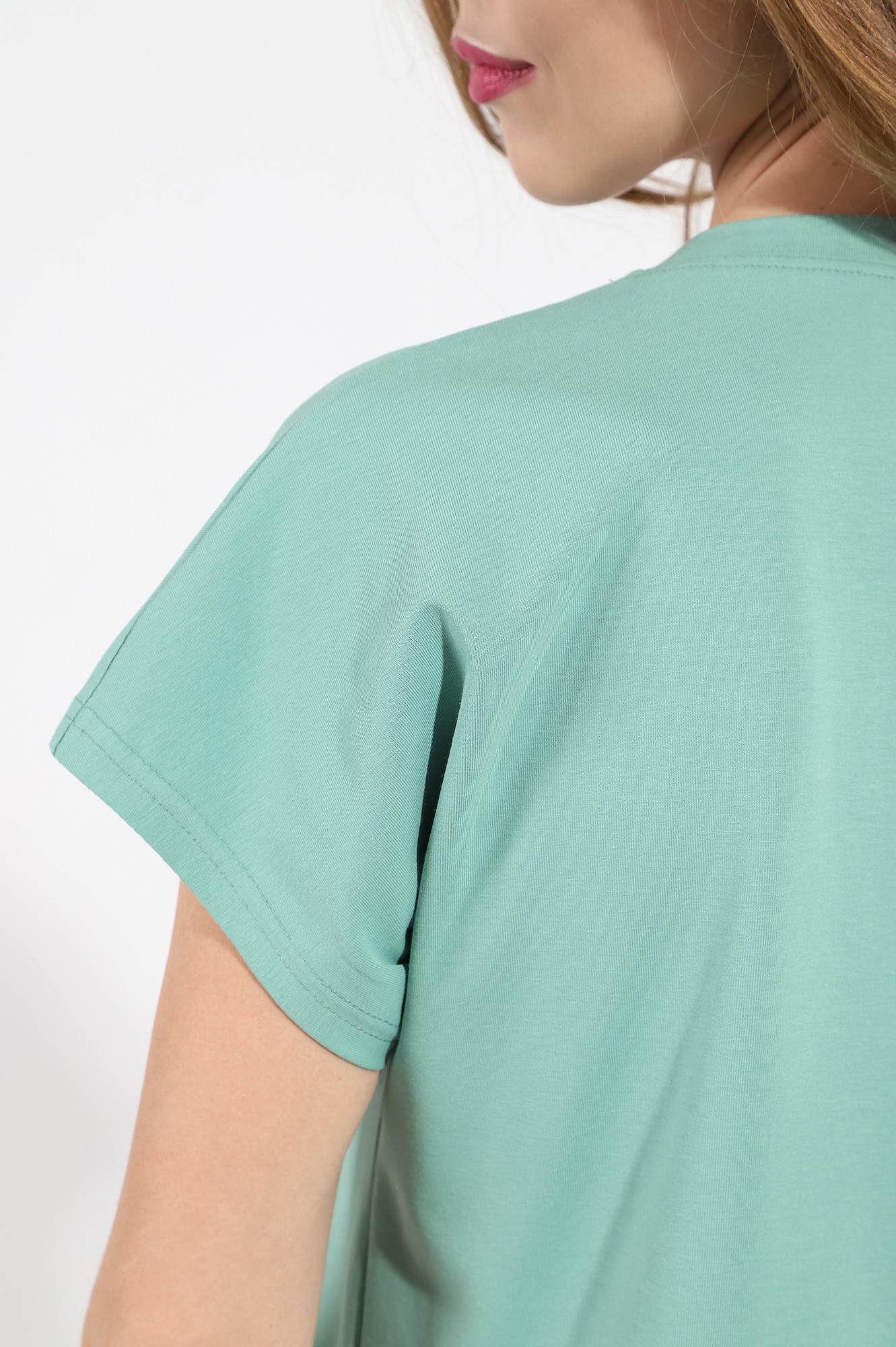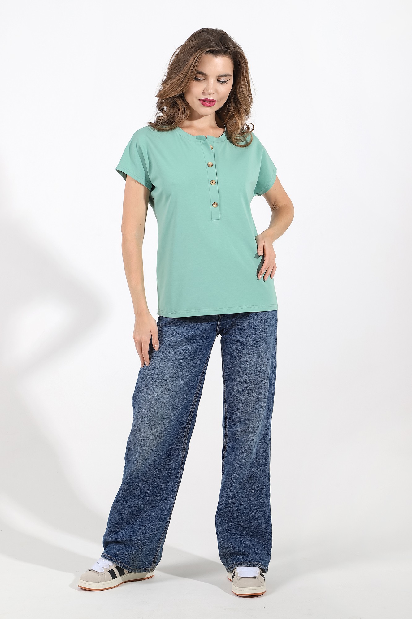 Футболка женская из гладкокрашенного полотна «кулирка» с лайкрой, с цельнокроеными рукавами, свободного силуэта, с горловиной овальной формы, обработанной притачной планкой, с имитацией застежки на петли и пуговицы.