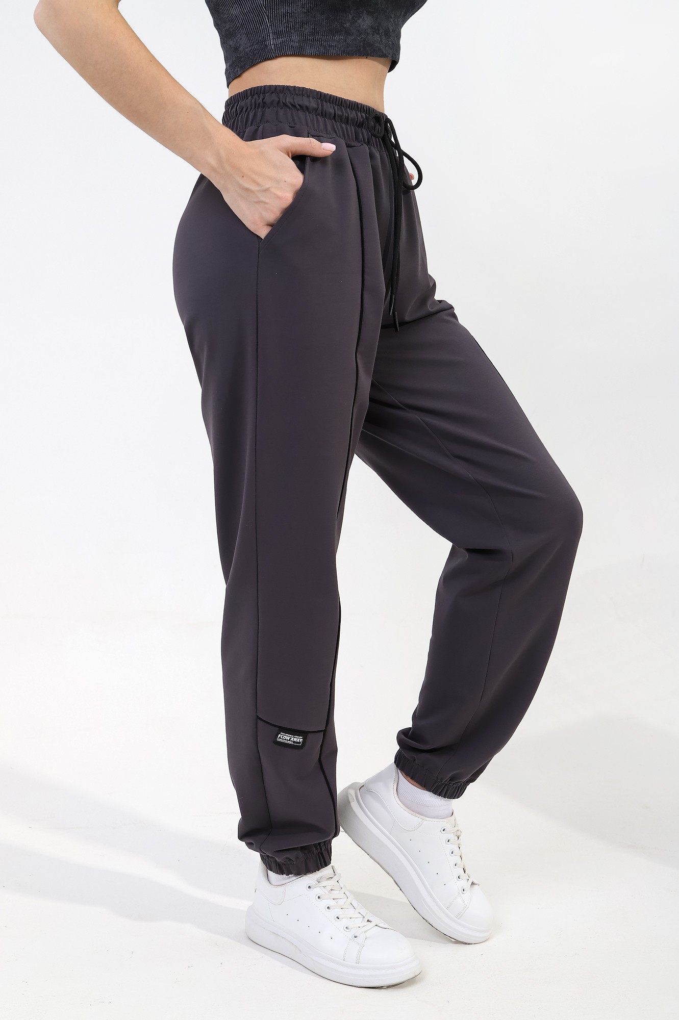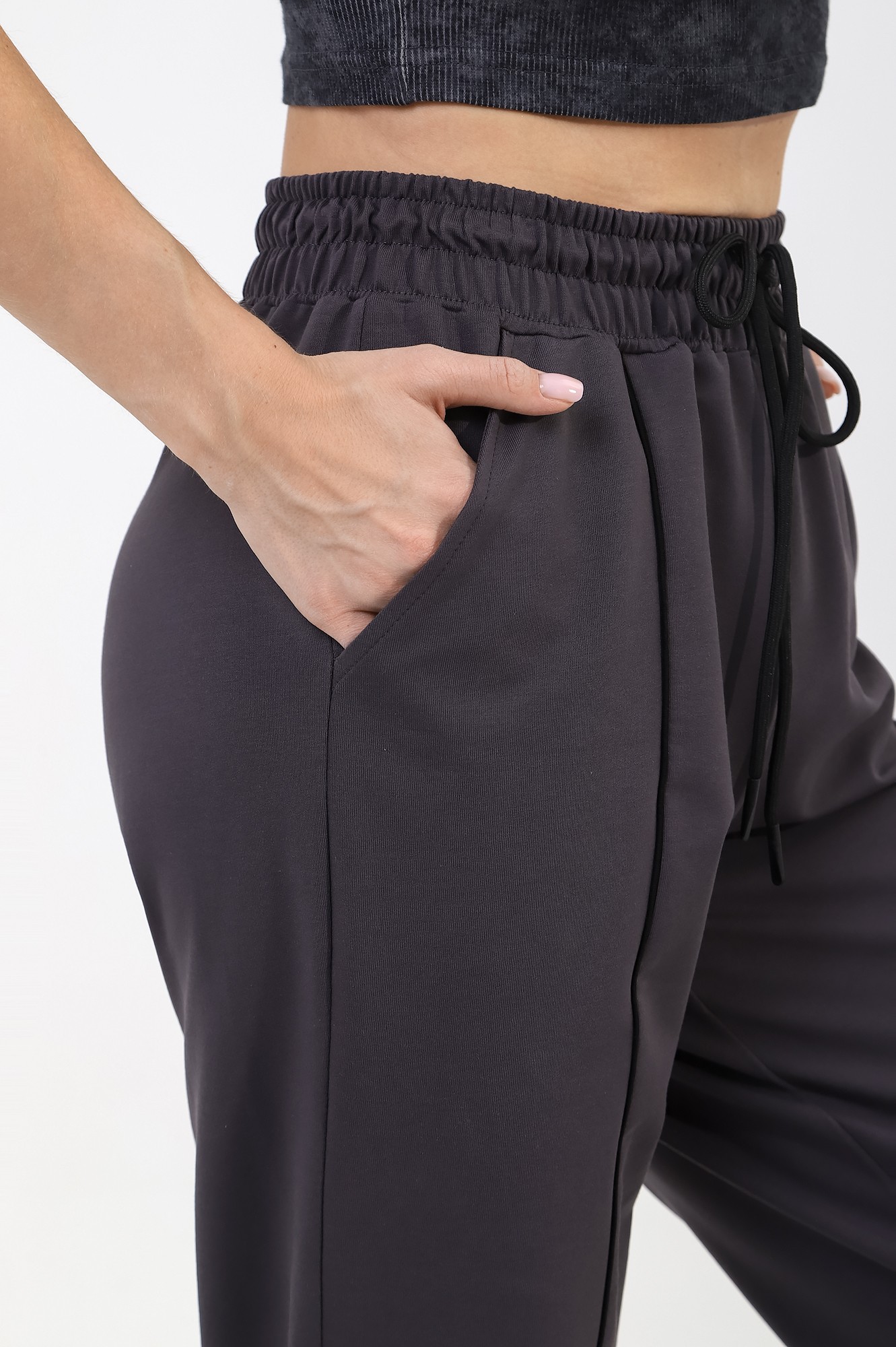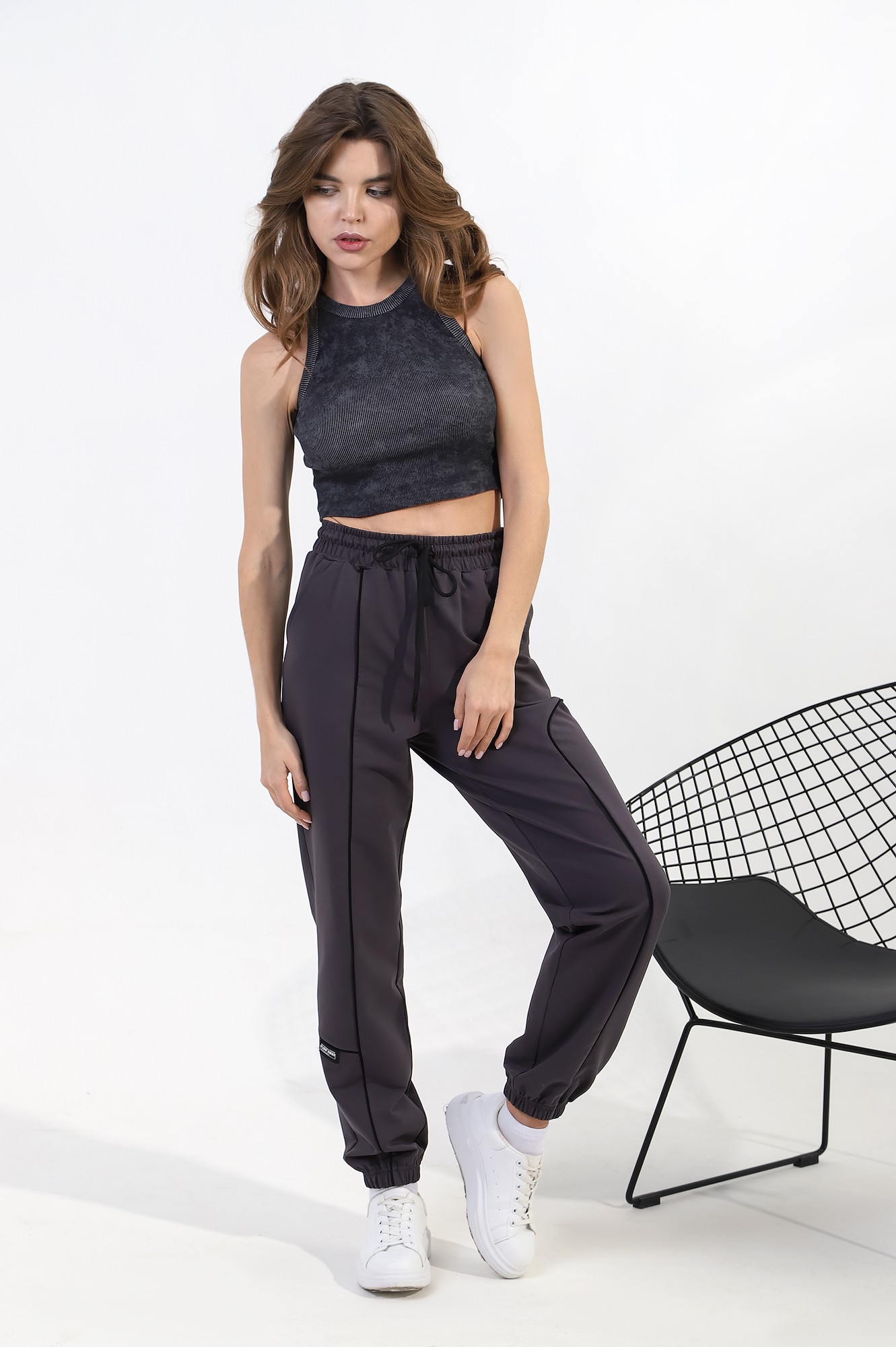 Брюки молодежные из трикотажного полотна «футер двунитка» с лайкрой, длинные, на притачном поясе с эластичной тесьмой внутри и шнурком, продетым через две петли в центре пояса, с карманами в боковых швах и эластичной тесьмой по низу. Правая половина брюк – из трех частей, левая - из двух частей фигурной формы, с кантом контрастного цвета в соединительных швах. На правой половине по горизонтальному шву настрочен декоративный элемент.