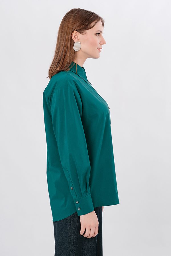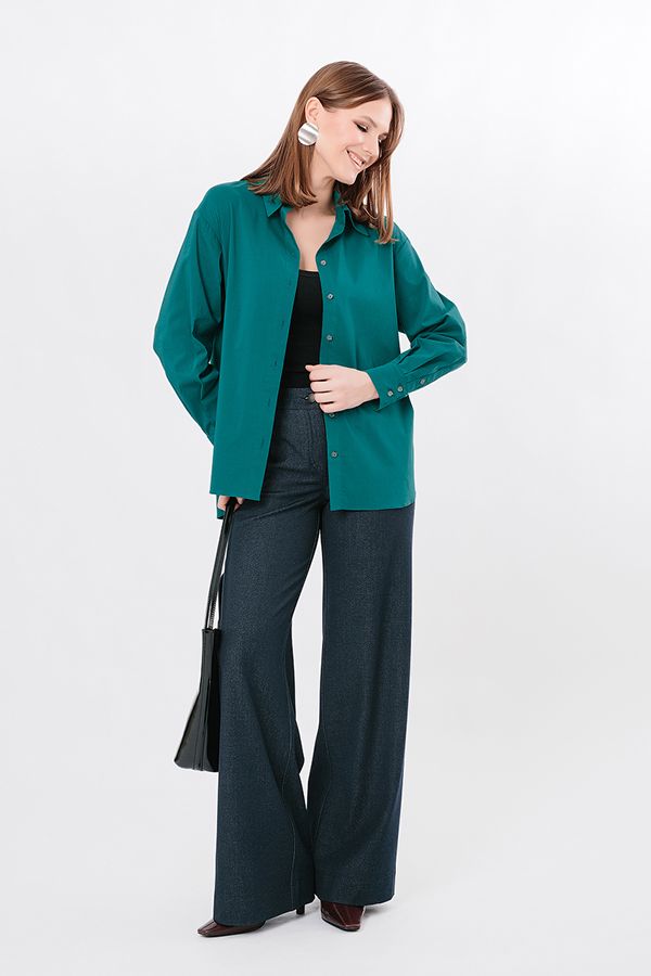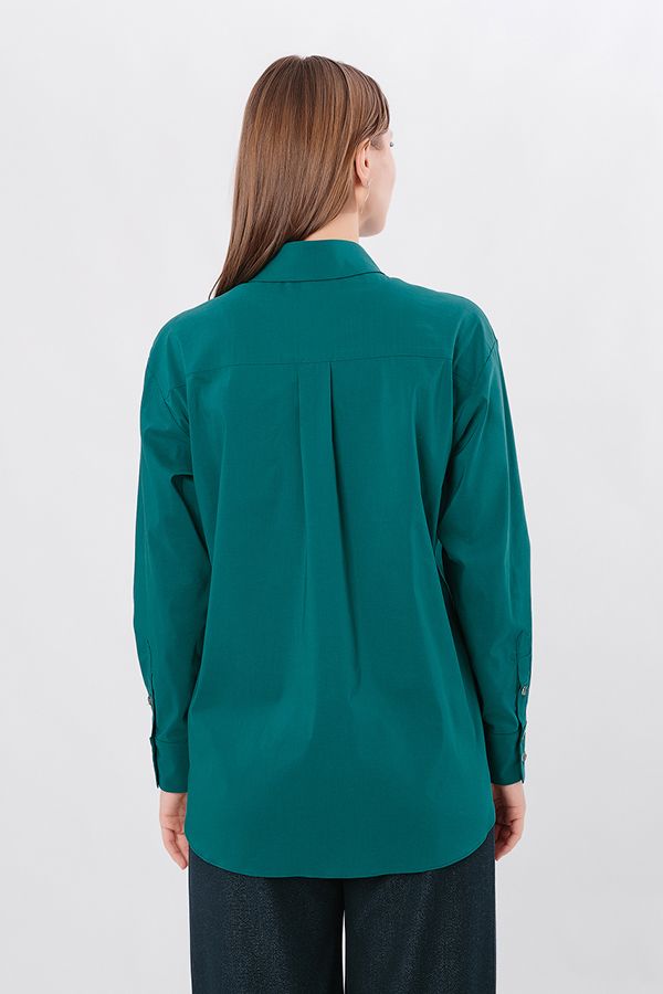 Классическая рубашка свободного силуэта из облегченной костюмной ткани. Застежка на пуговицы, по спинке кокетка.  Длина по спинке  75 см. *Числовые параметры соответствуют размеру 44. Размер модели на фото: 44.  Параметры модели: 90-64-97. Рост модели на фото: 175 см.