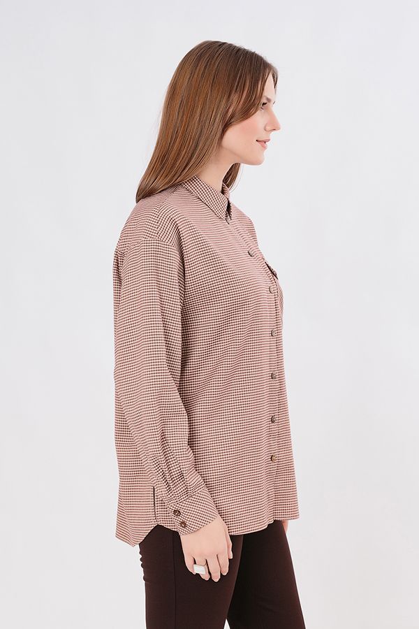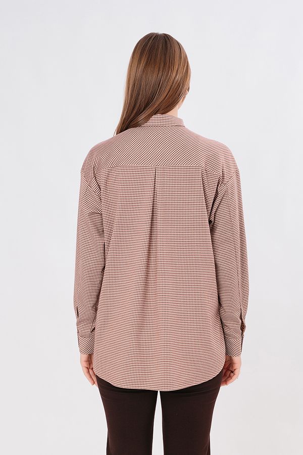 Классическая рубашка свободного силуэта из облегченной костюмной ткани. Застежка на пуговицы, по правой передней половинке, карман с клапаном, по спинке кокетка. В боковых швах разрезы. Длина по спинке  75 см. *Числовые параметры соответствуют размеру 44. Размер модели на фото: 44.  Параметры модели: 90-64-97. Рост модели на фото: 175 см.