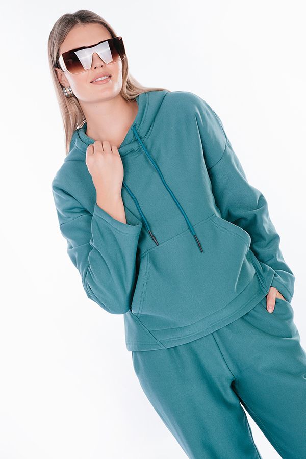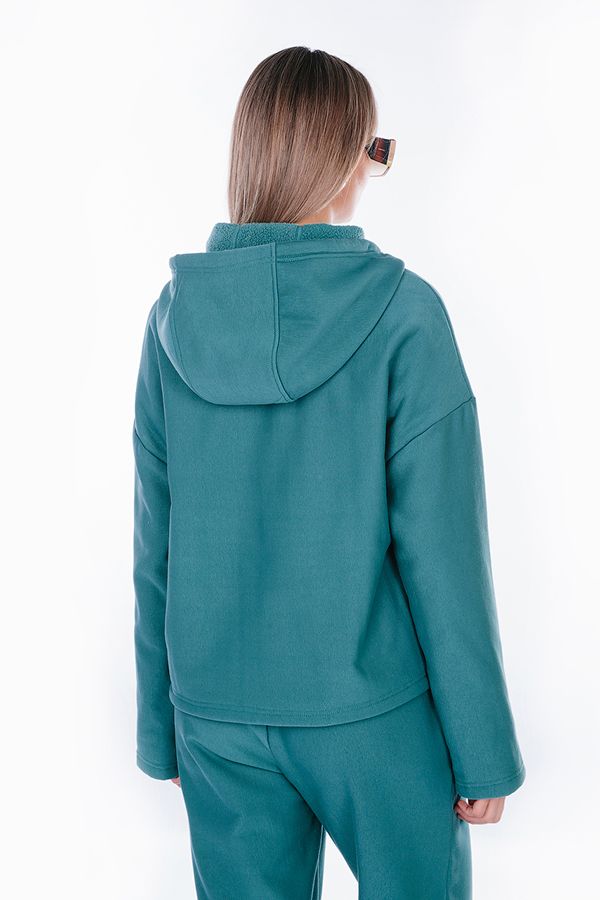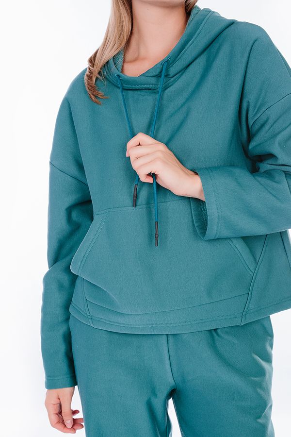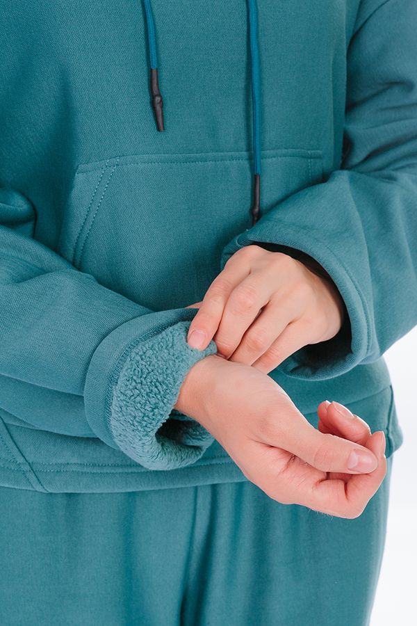Толстовка с капюшоном из футера на флисе (барашек). Карман кенгуру. Рукав отрезной, плечо спушенное.  Длина по спинке- 61 см. Ширина низа -59 см. Числовые параметры соответствуют размеру 44. Размер модели на фото: 44. Параметры модели: 86-63-94. Рост модели на фото: 173 см.