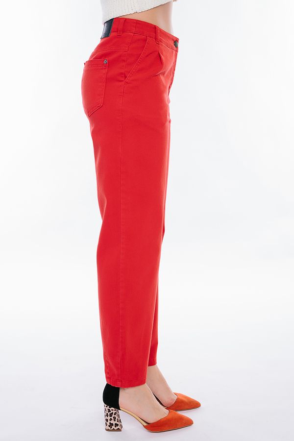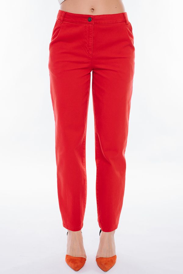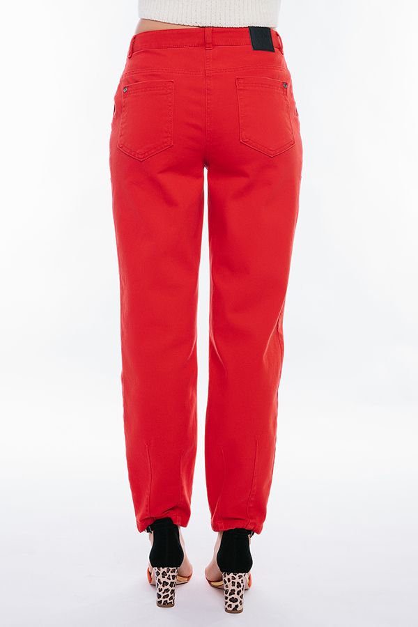 Молодежные джинсы-бананы сочного красного цвета. Детали: спереди застежка на молнию и пуговицу, боковые карманы с отрезным бочком, по линии пояса защипы, сзади под кокеткой накладные карманы с хольнитенами. На поясе шлевки. По линии низа брюк оригинальная отделка - две вертикальные вытачки. Длина по внутреннему шву - 70,5 см. Ширина по линии низа -  16 см. *Числовые параметры соответствуют размеру 42. Размер модели на фото: 42. Параметры модели: 86-63-94. Рост модели на фото: 173 см.