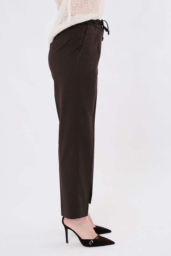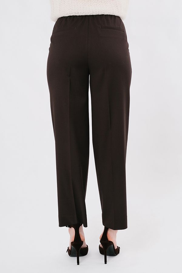 Классическая модель брюк со стрелками. Детали: брюки с высокой посадкой, двойная застежка на крючки и потайную пуговицу, молния. Вытачки, боковые карманы. Сзади имитация карманов. В поясе резина на сборке, кулиска. Длина по внутреннему шву - 71,5 см. Ширина низа - 20,5 см. *Числовые параметры соответствуют размеру 44. Размер модели на фото: 44. Параметры модели: 90-64-97. Рост модели на фото: 175 см.