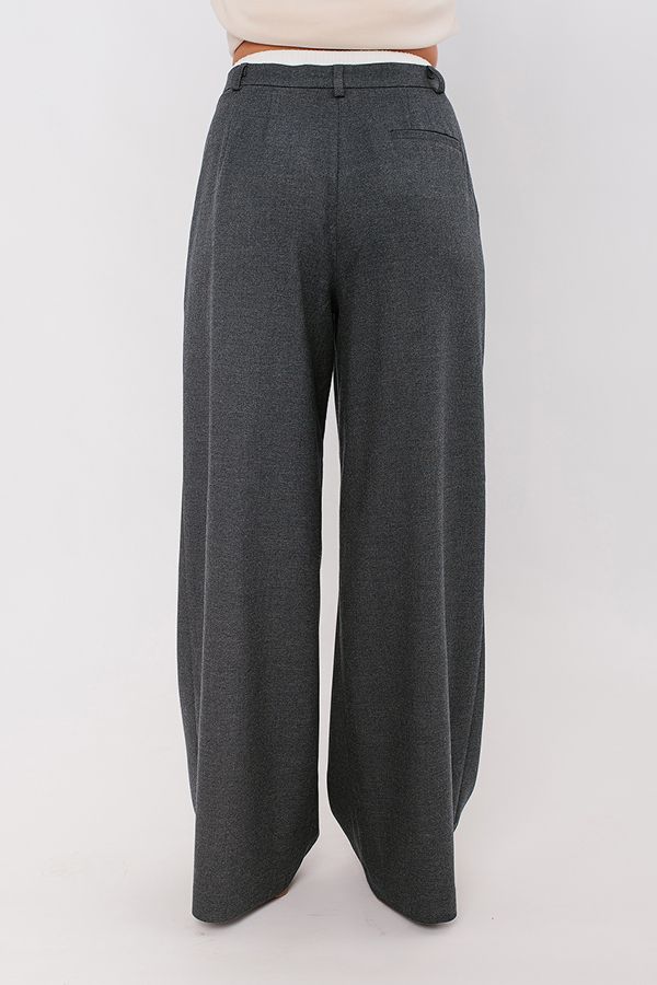 Молодежная модель брюк с "трусами". Мягкая костюмная ткань актуального серого цвета. Детали: Спереди  застежка на погувицу и молнию,  по бокам карманы, по поясу два защипа. Сзади , по правой половинке имитация кармана в рамке, по две вытачки, на посясе шлевки. К поясу брюк пришит белый  бельевой трикотажный пояс-резинка на двух кнопках - имитаци "трусов".  Брюки плотно садятся по талии и свободно прилегают по бедрам. Длина по внутреннему шву - 80 см. Ширина по линии низа: 34 см. *Числовые параметры соответствуют размеру 44. Размер модели на фото: 44.  Параметры модели: 86-63-94. Рост модели на фото: 173 см.
