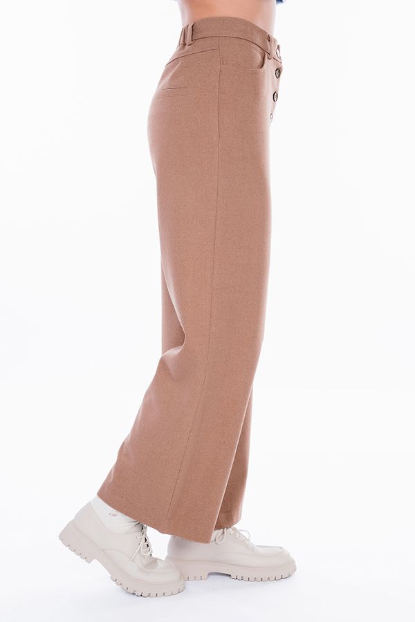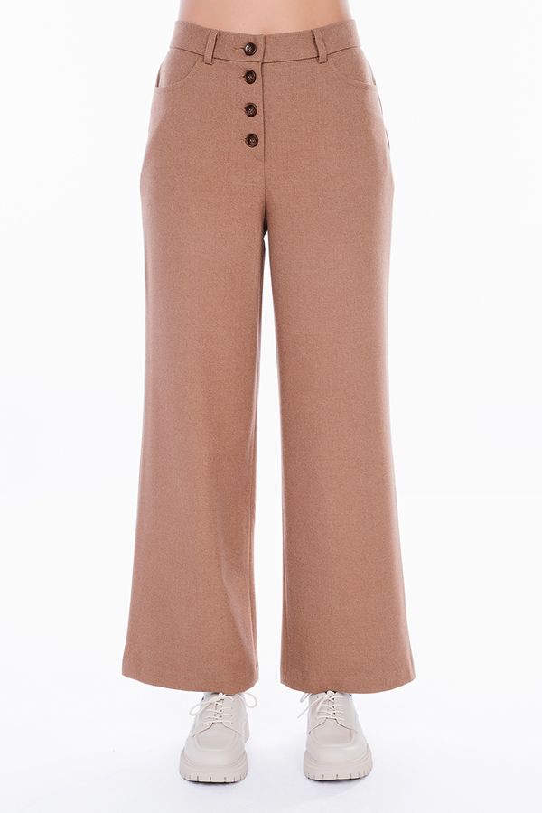 Брюки-кюлоты в городском стиле. .  Детали: застежка на четыре пуговицы, по бокам полноценные карманы, сзади под кокеткой листочки. На поясе шлевки, по спинке резина на сборке. Длина по внутреннему шву - 73 см. Ширина низа - 28 см. *Числовые параметры соответствуют размеру 44. Размер модели на фото: 46.  Параметры модели: 86-63-94. Рост модели на фото: 173 см. (Маломерят).