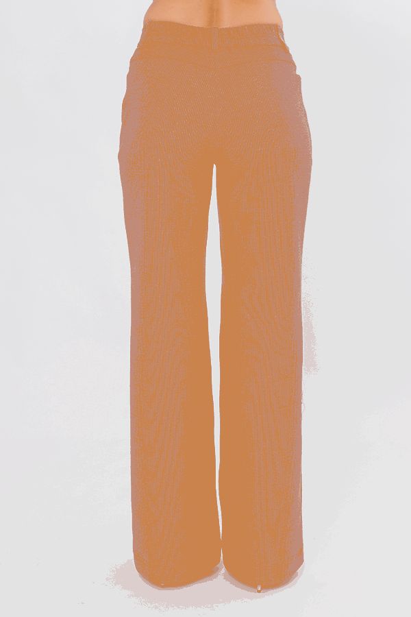 Современные брюки из теплого трикотажного полотна под "вельвет". Модный силуэт-клеш от середины бедра. Детали: спереди застежка на молнию и пуговицу, карманы с горизонтальным входом оформлены хольнитенами. Фигурный пояс со шлевками, по спинке пояса резина на сборке. Длина по внутреннему шву-87 см. Ширина низа- 29,5 см. "числовые параметры соответствуют размеру 44.  размер модели на фото 44. Параметры модели: 86-63-94. Рост модели на фото: 173 см.