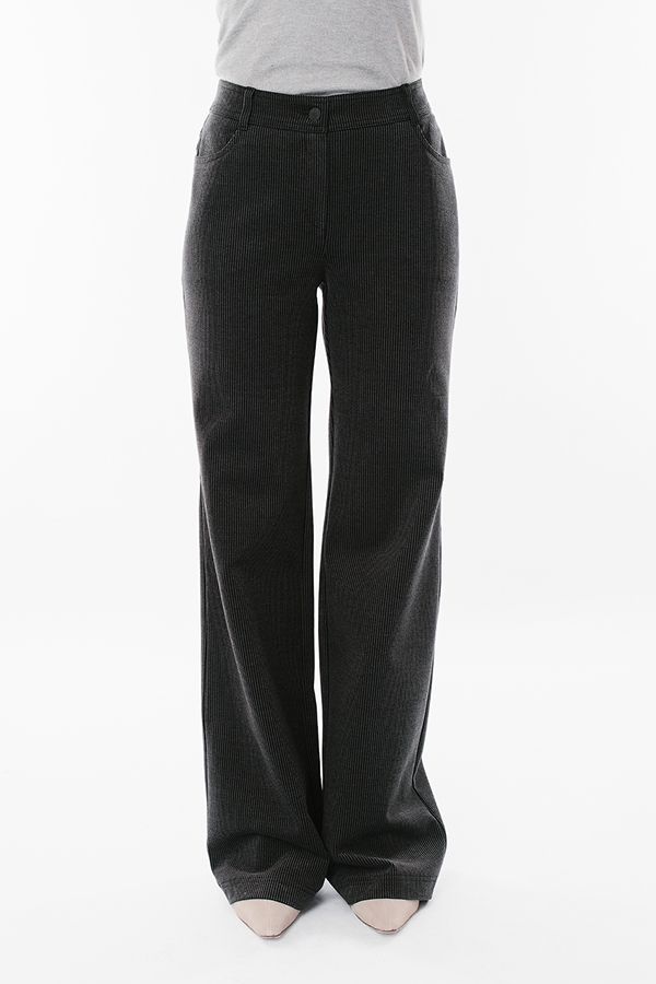 Современные брюки из теплого трикотажного полотна под "вельвет". Модный силуэт-клеш от середины бедра. Детали: спереди застежка на молнию и пуговицу, карманы с горизонтальным входом оформлены хольнитенами. Фигурный пояс со шлевками, по спинке пояса резина на сборке. Длина по внутреннему шву-85 см. Ширина низа- 29 см. "числовые параметры соответствуют размеру 42.  размер модели на фото 44. Параметры модели: 86-63-94. Рост модели на фото: 173 см.