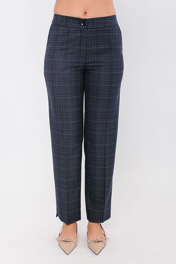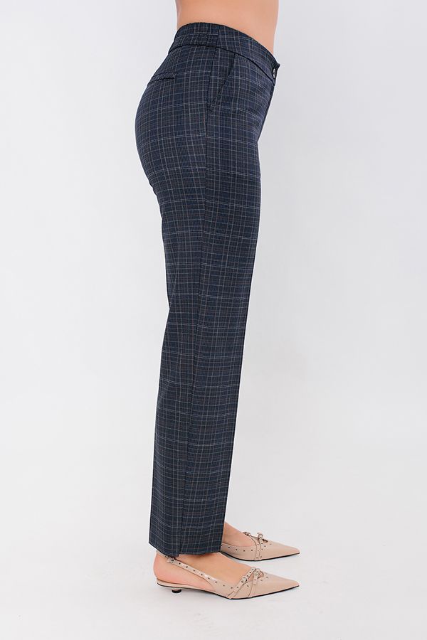 Модель брюк из  костюмной ткани в городском стиле. Спереди застежка на молнию и пуговицу, боковые карманы, сзади по правой стороне листочка  с имитацией кармана. По передней половинке фигурный пояс, по задней половинке в поясе эластичная лента на сборке.  По низу изделия, в боковом шве  разрез 3 см. Длина по внутреннему шву - 74 см. Ширина низа - 19 см. *Числовые параметры соответствуют размеру 44. Размер модели на фото: 44. Параы модели: 86-63-94. Рост модели на фото: 173 см.