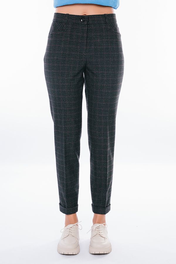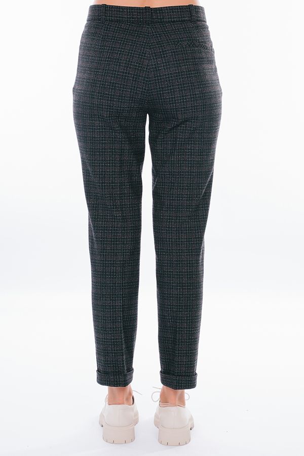 Модель в классическом стиле со стрелками. Детали: спереди застежка на молнию и пуговицу, боковые карманы с горизонтальным входом. Отделка сзади: вытачки, по правой половине листочка с имитацией кармана. В пояс вставлена эластичная лента. По линии низа отворот, который можно использовать для изменения длины брюк.