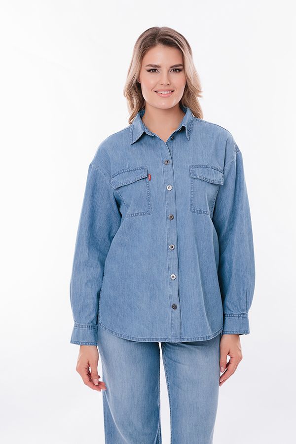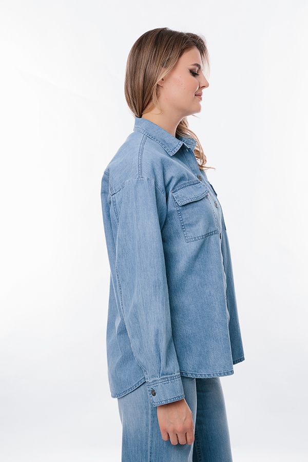 Классическая рубашка свободного силуэта из тонкого денима.  Детали: спереди застежка на пуговицы, накладные карманы с клапаном, в боковых швах разрезы, по спинке кокетка. Длина по спинке  73 см. Размер модели на фото: 46. Параметры модели: 94-65-100. Рост модели на фото: 175 см.