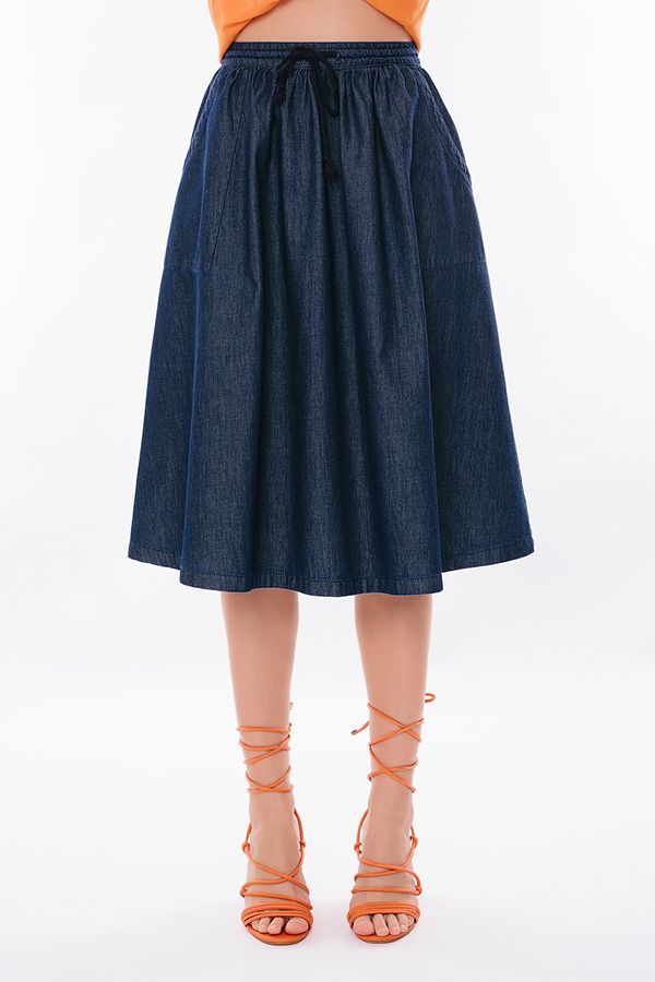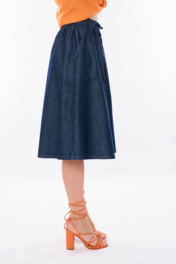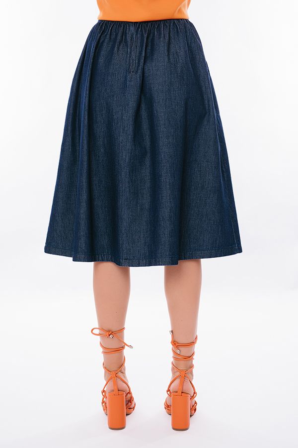 Модель юбки А-силуэта, с легкой сборкой по талии, свободная. Детли спереди: прямой пояс с кулиской, карманы оригинального кроя, сзади , в среднем шве молния Длина изделия 75 см. Размер модели на фото: 40. Параметры модели: 86-63-94. Рост модели на фото: 173 см.
