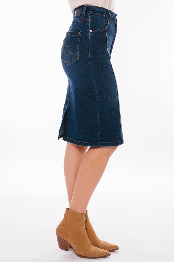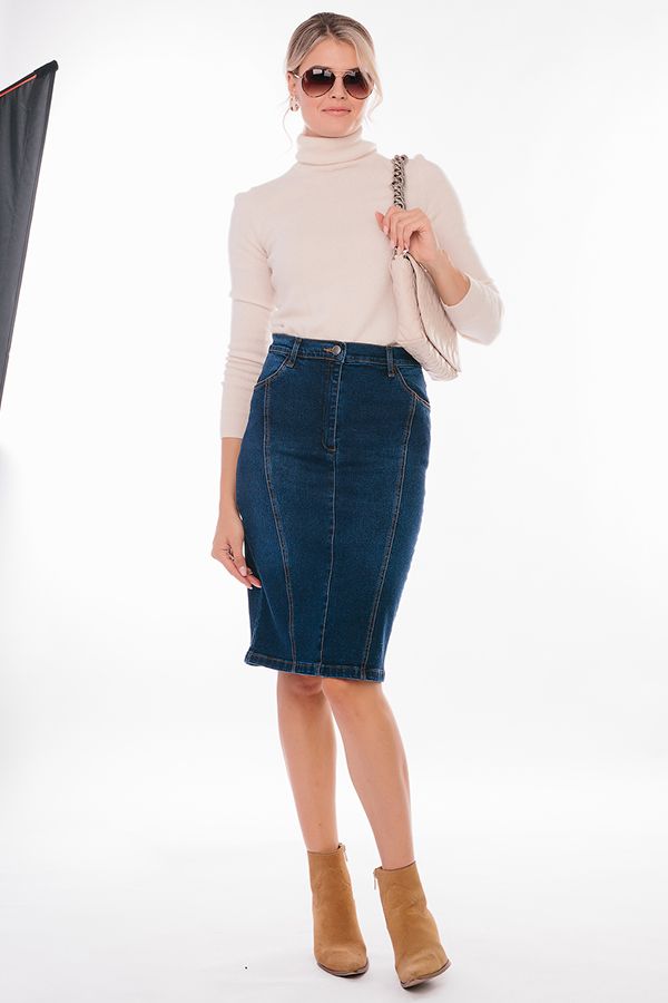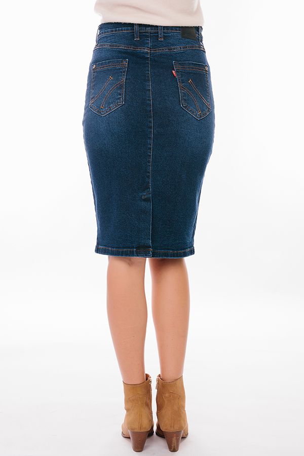 Юбка из денима, чуть приуженная, с рельефными отстрочками по передней половинке. Спереди карманы, сзади под кокеткой накладные карманы, разрез. Застежка на молнию и болт. На поясе шлевки.  Длина изделия - 61 см. Размер модели на фото: 44. Параметры модели: 86-63-94. Рост модели на фото: 173 см.