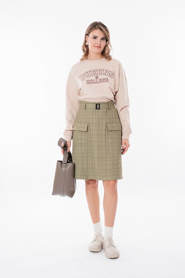 Молодежная модель юбки А-силуэта на подкладке.  Юбка выполнена без пояса, с молнией в среднем шве. По линии талии шлевки. Поясок с металлической пряжкой. По передней половинке изделия накладные карманы с клапанами. Длина 61 см. Размер  модели на фото: 44. Параметры модели: 86-63-94. Рост модели на фото : 173 см.