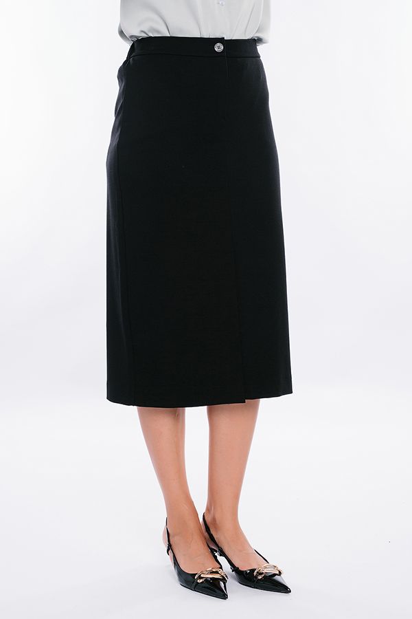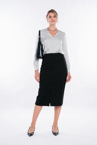 Юбка из черного трикотажного полотна на подкладке. Детали: Спереди застежка на молнию и пуговицу, в среднем шве шлица. Сзади вытачки в поясе резина. Длина изделия 77 см. Размер модели на фото: 44.  Параметры модели: 86-63-94. Рост модели на фото: 173 см.