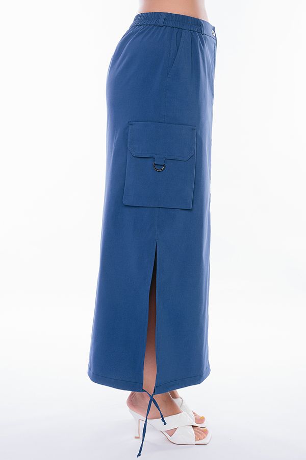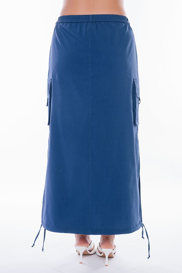 Юбка из легкого бенгалина в стиле "карго".  Юбка длинная, прямого силуэта. По переду карманы с отрезным бочком, застежка на молнию и пуговицу, в поясе резина. На поясе шлевки. По бокам юбки объемные накладные карманы с клапаном, По низу кулиска. В боковых швах разрезы. Длина изделия- 91 см. Размер модели на фото: 48. Параметры модели: 94-68-102. Рост модели на фото : 175 см.