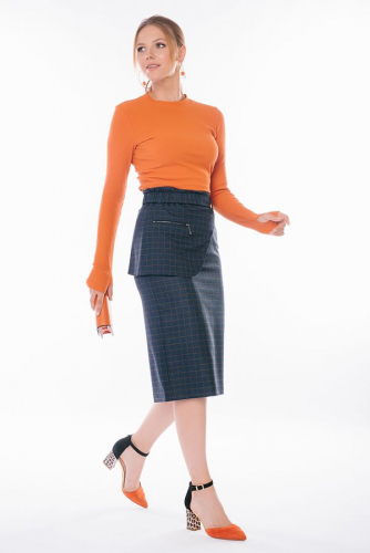 Элегантная юбка со съемной баской. Спереди вытачки, сзади молния в среднем шве, вытачки, шлица. Юбка на подкладе. Баска  с карманом на молнии, в шлевки вставлен тканевый пояс на резине, с пряжкой. Длина изделия 68 см. Размер модели на фото: 44. Параметры модели: 89-62-97. Рост модели на фото: 175 см.
