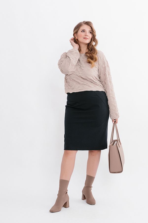 Элегантная юбка оригинального кроя без пояса. Детали: боковые швы передней половины изделия, переходят на заднюю половину и заканчивается разрезами. Сзади потайная молния в среднем шве, по две вытачки с каждой стороны.  Длина изделия 58 см. Размер модели на фото: 52. Параметры модели: 100-82-113. Рост модели на фото: 170 см.