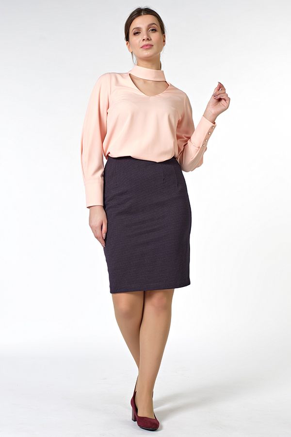 Юбка выполнена из трикотажного полотна в элегантном темно-синем цвете в мелкий горох. Модель без застежки, в пояс вставлена эластичная лента, по передней и задней половинке по две вытачки с каждой стороны.  В составе ткани высокое содержание вискозы, что обеспечивает изделию комфортность и мягкость. Длина изделия 60 см. Размер модели на фото: 46 Параметры модели: 94-71-102 Рост модели на фото: 173