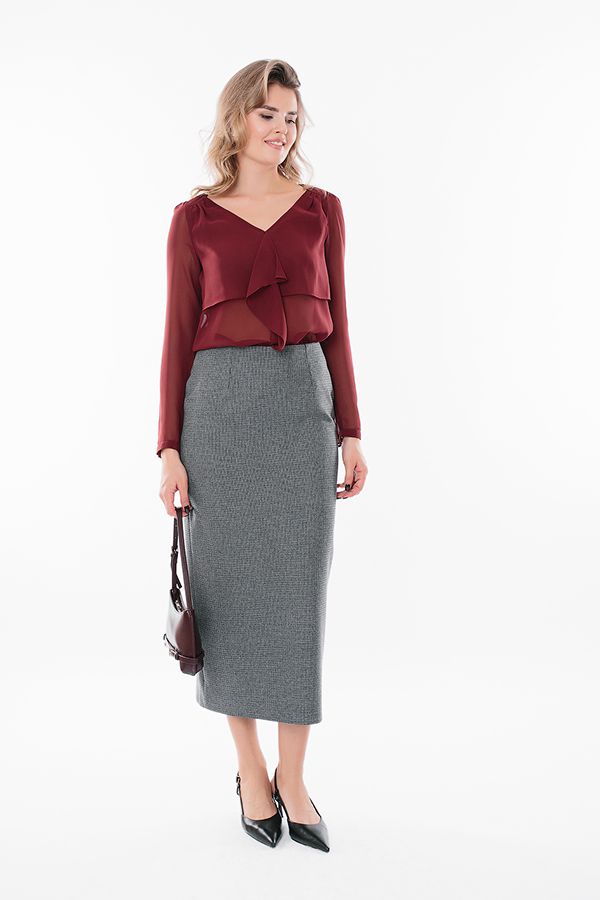 Актуальная модель прямой юбки- миди. Юбка на подкладке, без пояса, по переду изделия вытачки. По задней половинке по две вытачки, застежка на потайную молнию в среднем шве, щлица.  Длина изделия 88 см. Размер модели на фото: 44.  Параметры модели: 86-63-94. Рост модели на фото: 173 см.