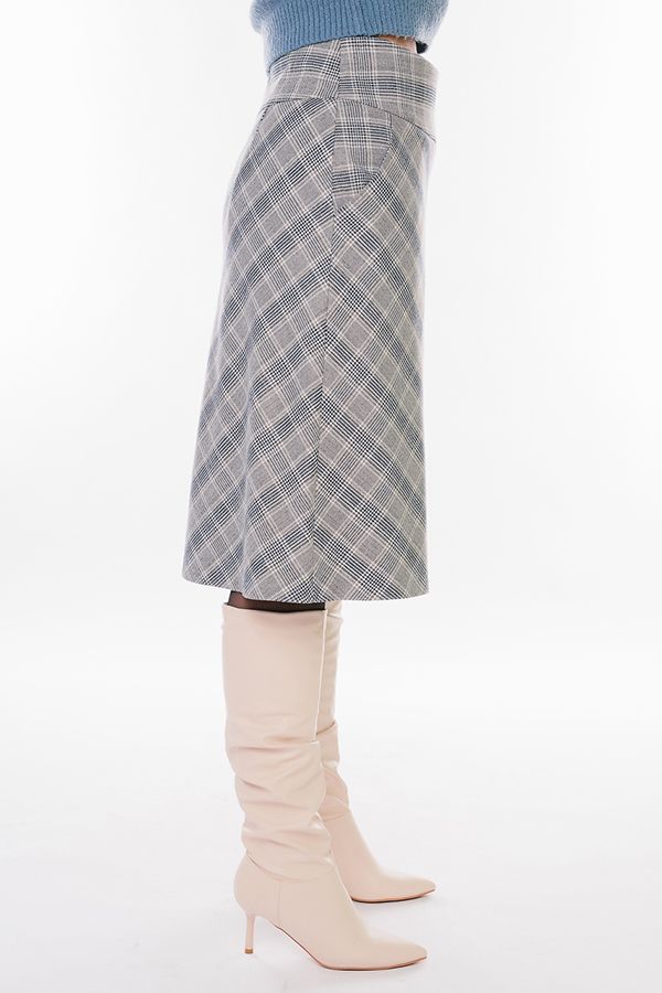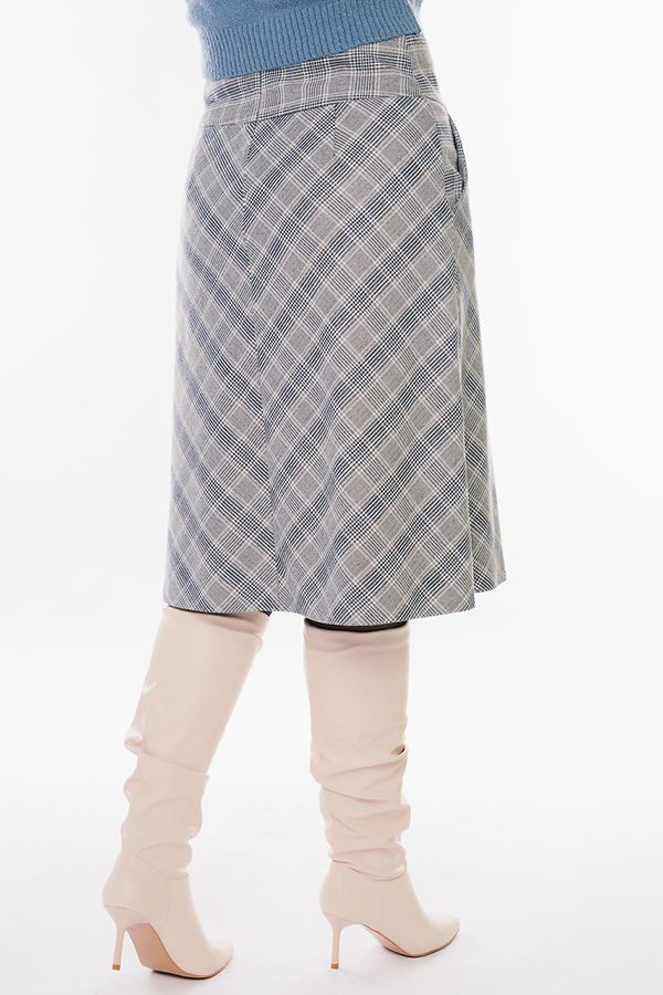 Юбка А-образного силуэта из серой клетки. Юбка на широком поясе- кокетке, спереди карманы с отрезным бочком. Сзади вытачки, в среднем шве потайная молния. Юбка выполнена на подкладе. Длина изделия: 68 см.  Размер  модели на фото: 48.  Параметры модели: 94-68-102. Рост модели на фото: 175 см.