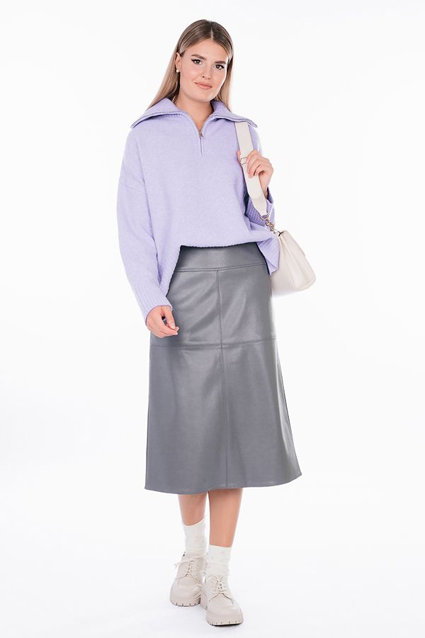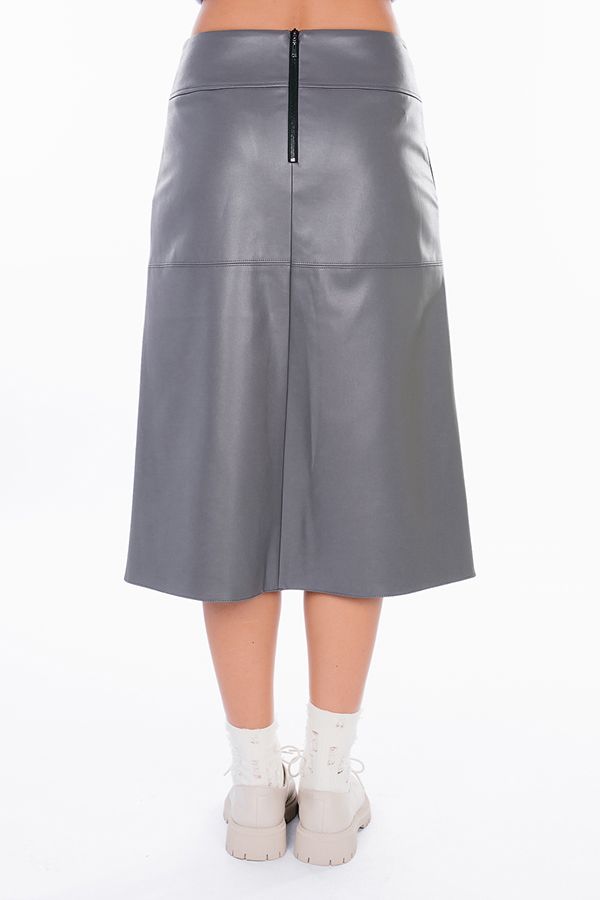 Юбка А-образного силуэта из эко-кожи с рельефными отстрочками. Юбка на широком поясе- кокетке, спереди карманы с отрезным бочком. Сзади в среднем шве металлическая молния. Длина изделия: 70 см.  Размер  модели на фото: 44.  Параметры модели: 86-63-94. Рост модели на фото: 173 см.