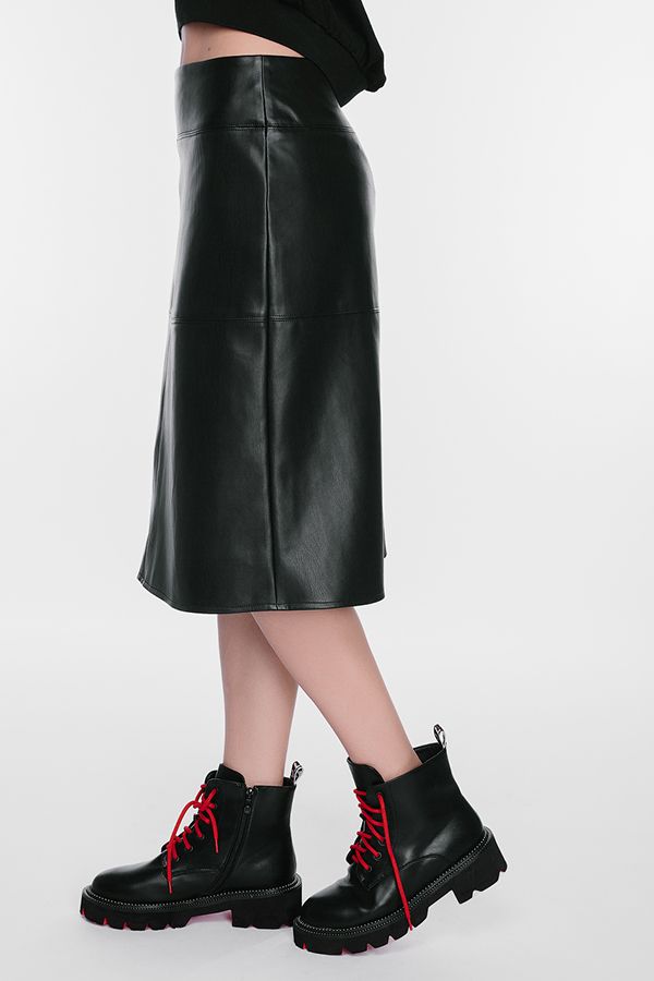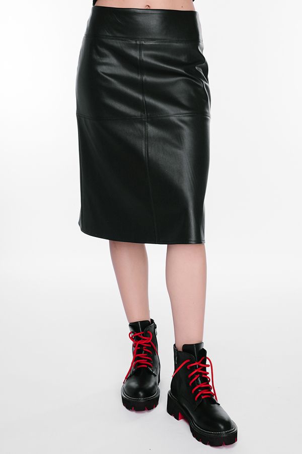 Молодежная модель юбки А-силуэта из популяпной эко-кожи черного цвета на подкладке. Юбка выполнена без пояса, на фигурной кокетке, сзади металлическая молния. Длина 66 см. Размер модели на фото : 42,. Параметры модели: 86-63-94. Рост модели на фото: 173 см.