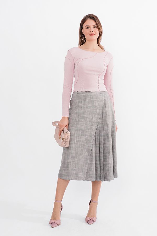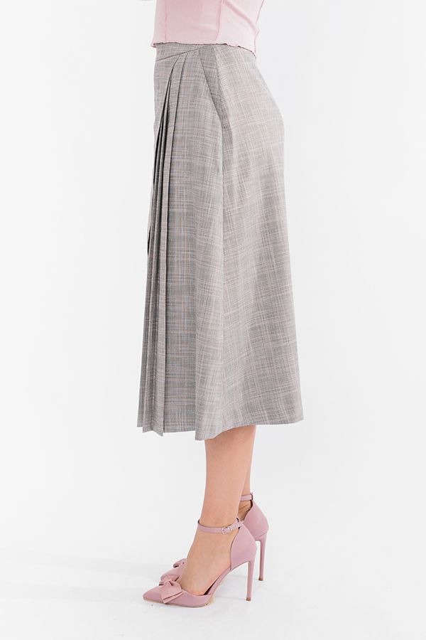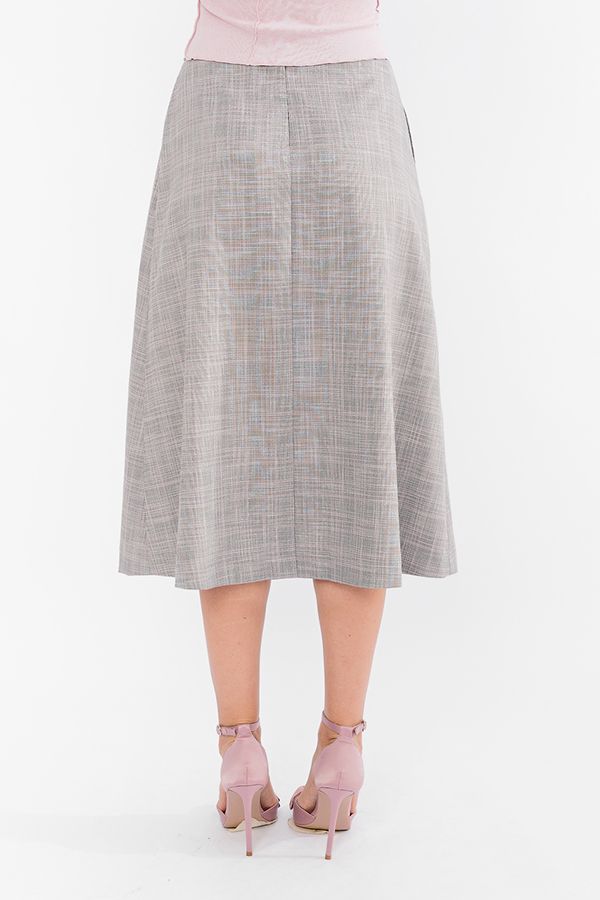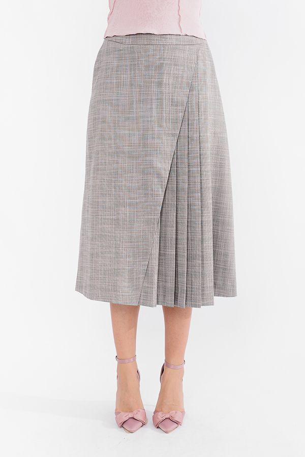 Эффектная модель юбки А-силуэта на фигурным поясе. Детали спереди: карманы с отрезным бочком, асимметричный запах на левую сторну. По правой стороне юбки- пять складок. Сзади в среднем шве потайная молния. Длина изделия 79 см. Размер модели на фото: 44. Параметры модели: 86-63-94. Рост модели на фото: 173 см.