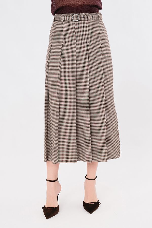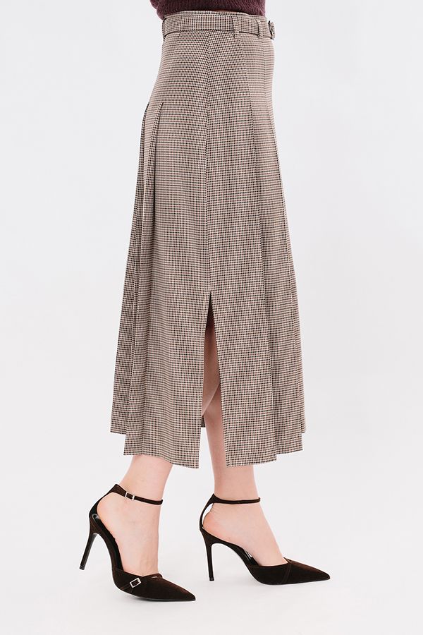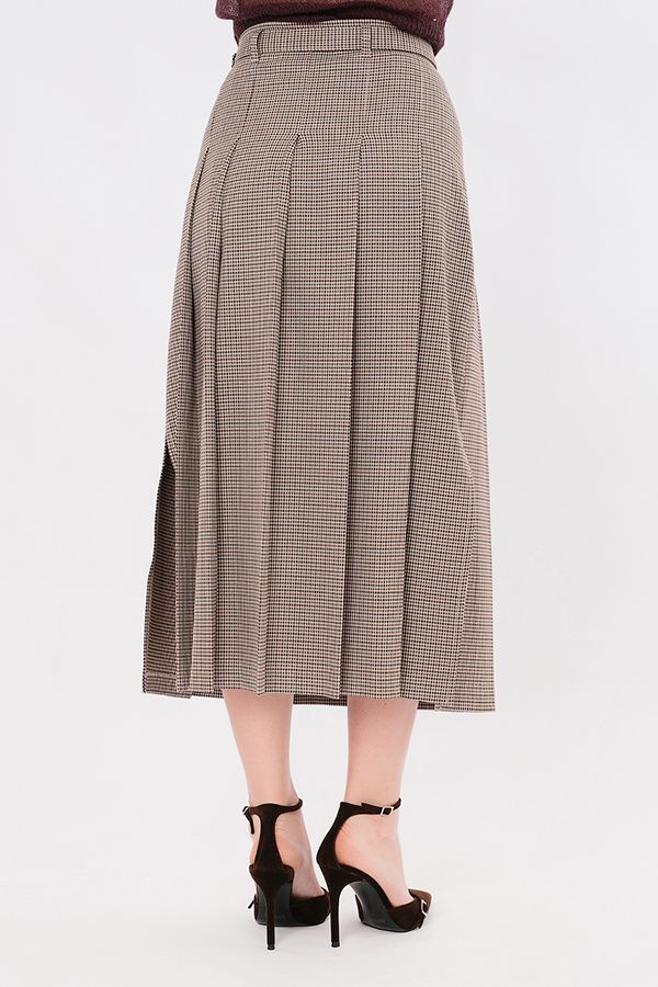 Юбка А-силуэта в широкую складку из костюмной ткани в гусиную лапку. Детали: в боковом шве застежка на потайную молнию, на поясе шлевки, тканевый ремень с металлической пряжкой. Складки застроченны на 12,5 см. от верха изделия,  в боковых швах разрезы  35 см.( от низа изделия). Длина изделия: 88 см.  Размер  модели на фото: 46.  Параметры модели:90-64-97. Рост модели на фото: 175 см.
