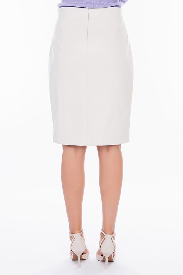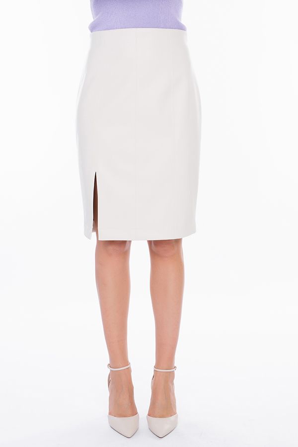 Юбка прямого кроя из эко-кожи белого цвета  с рельефными отстрочками по передней и задней полочке. Застёжка потайная на молнии, расположена сзади, в среднем шве. По переду с правой стороны разрез, благодаря которому юбка не будет сковывать ваших движений во время ходьбы. Длина изделия 61 см. Числовые параметры соответствуют размеру 44. Размер модели на фото: 44. Параметры модели: 86-63-94. Рост модели на фото: 173 см.