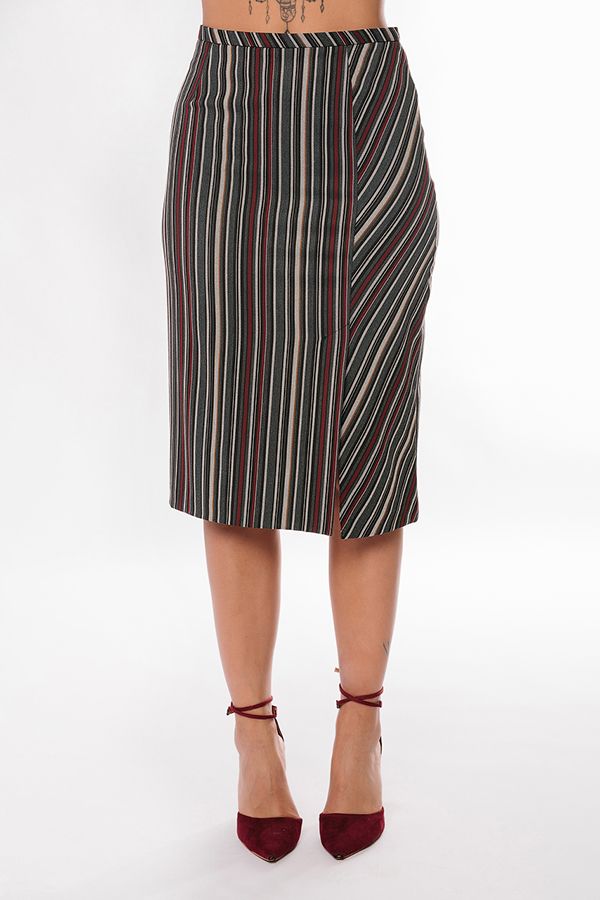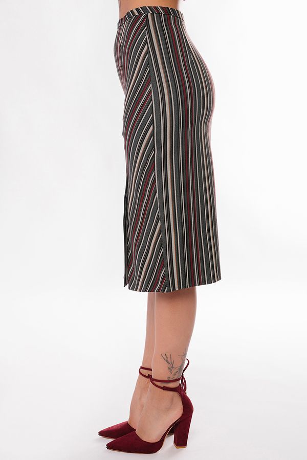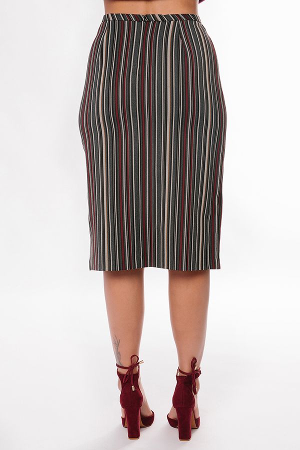 Юбка-карандаш оригинального кроя из легкой костюмной тканив полоску. Длина миди. По передней половинке , слева шлица, вытачки. По задней половинке вытачки, застежка на молнию в среднем шве. Длина изделия -71 см. Размер модели на фото 46. Параметры модели: 86-64-100. Рост модели на фото: 174 см.