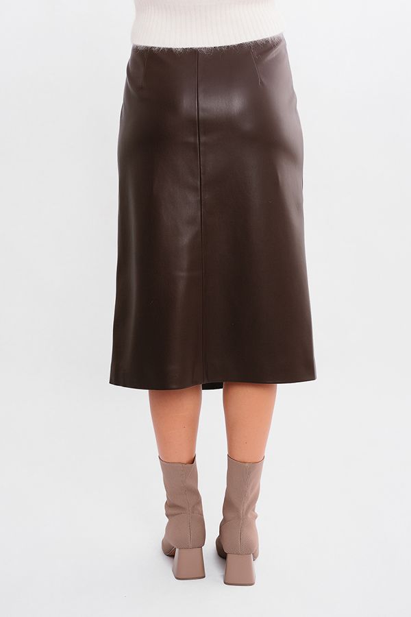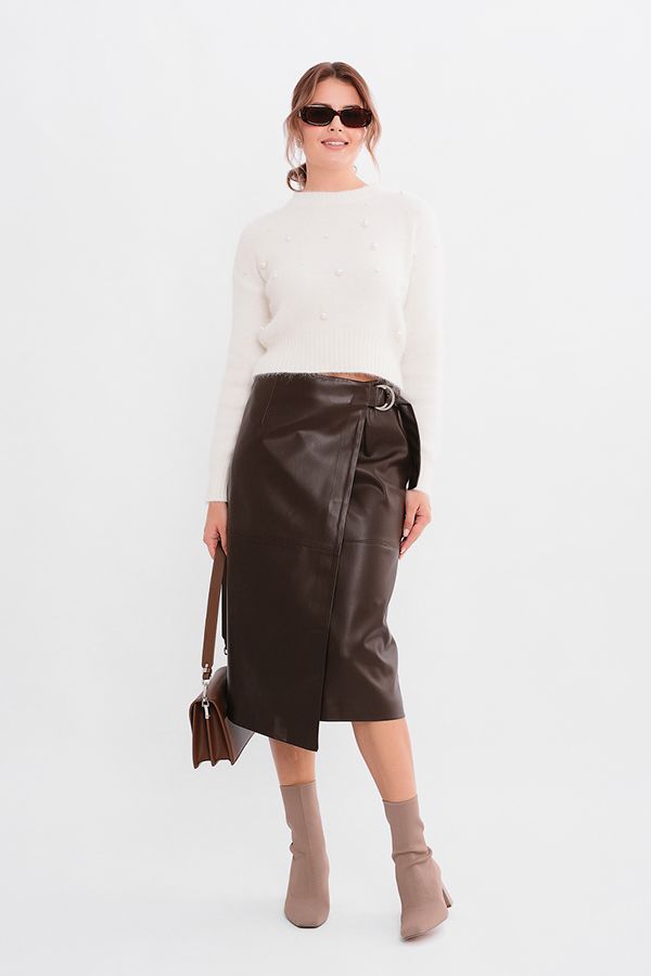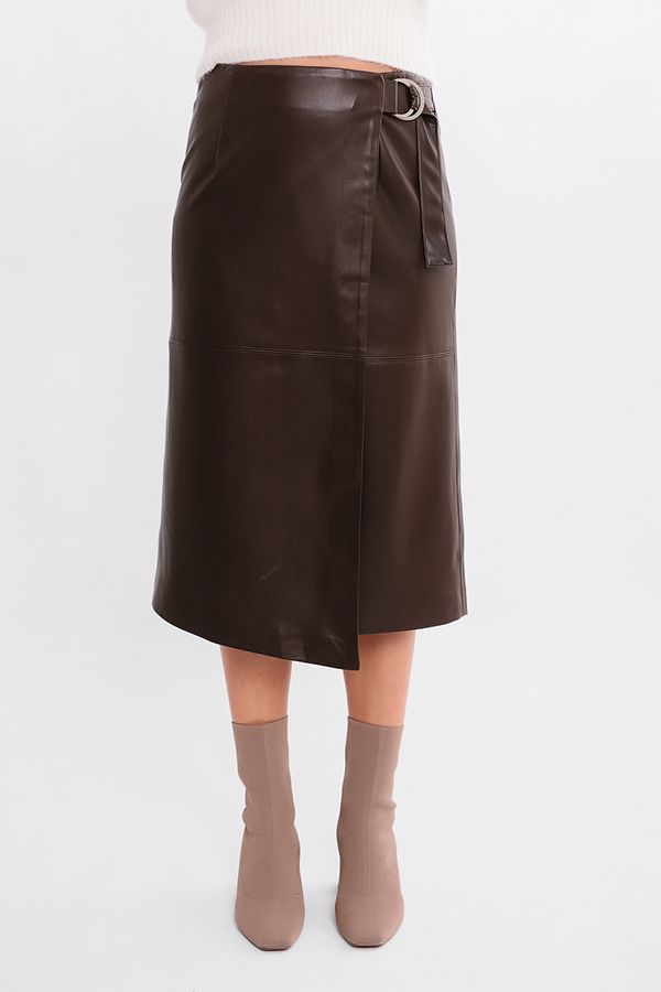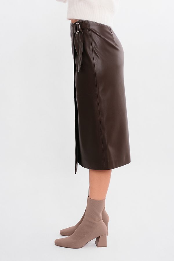 Юбка с асимметричным запахом из темно-коричневой эко-кожи. По переду изделия горизонтальный рез с отстрочками. Застежка на две потайные кнопки по линии пояса и декоративный пояс с пряжкой. По спинке поясные вытачки. ВНИМАНИЕ! Изделие нельзя стирать! Длина изделия 71 см. Числовые параметры соответствуют размеру 44. Размер модели на фото: 44. Параметры модели: 86-63-94. Рост модели на фото: 173 см.